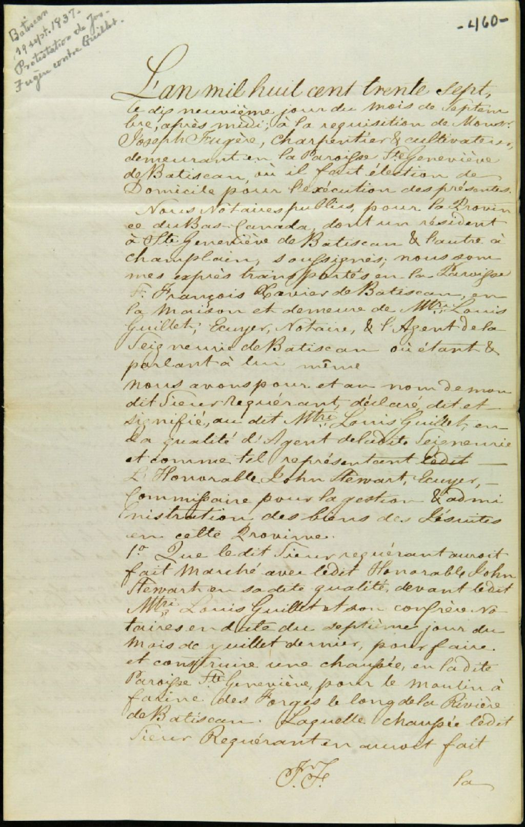 - Protêt à la requête de Joseph Fugère, charpentier et cultivateur, de la paroisse Sainte-Geneviève-de-Batiscan, à l'encontre de Louis Guillet, notaire et agent des biens des Jésuites pour la seigneurie de Batiscan, résidant en la paroisse Saint-François-Xavier-de-Batiscan, au sujet de la construction d'une chaussée en la paroisse Sainte-Geneviève pour le moulin à farine des forges le long de la rivière Batiscan