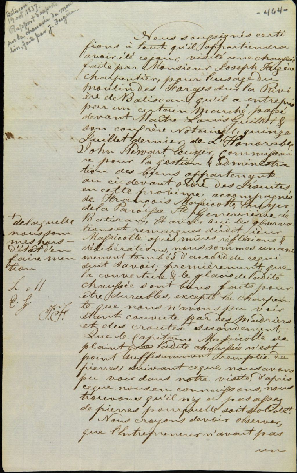 Certificat de visite d'une chaussée au moulin à farine des forges de Batiscan par Louis Marchand, meunier, de la paroisse Sainte-Geneviève, et François Massicotte, charpentier, de la paroisse Saint-François-Xavier-de-Batiscan, 19 octobre 1837, Archives nationales à Québec, Fonds Ministère des Terres et Forêts, (03Q,E21,S64,SS5,SSS10,D464).