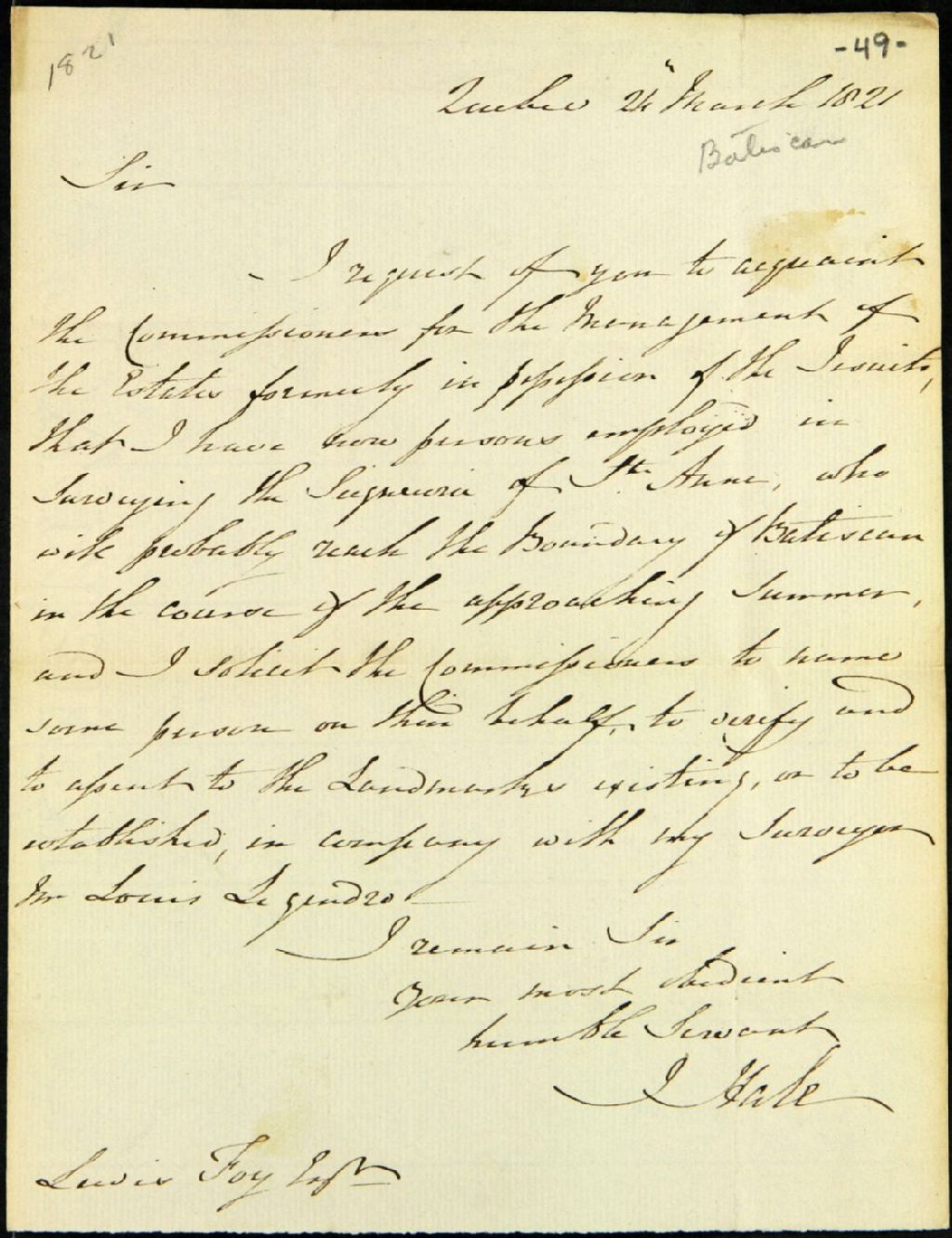 Lettre de J. Hale, de Québec, à Lewis Foy, pour faire dresser la ligne de séparation des seigneuries de Batiscan et de Sainte-Anne, 24 mars 1821, Archives nationales à Québec, Fonds Ministère des Terres et Forêts, (03Q,E21,S64,SS5,SSS10,D49).