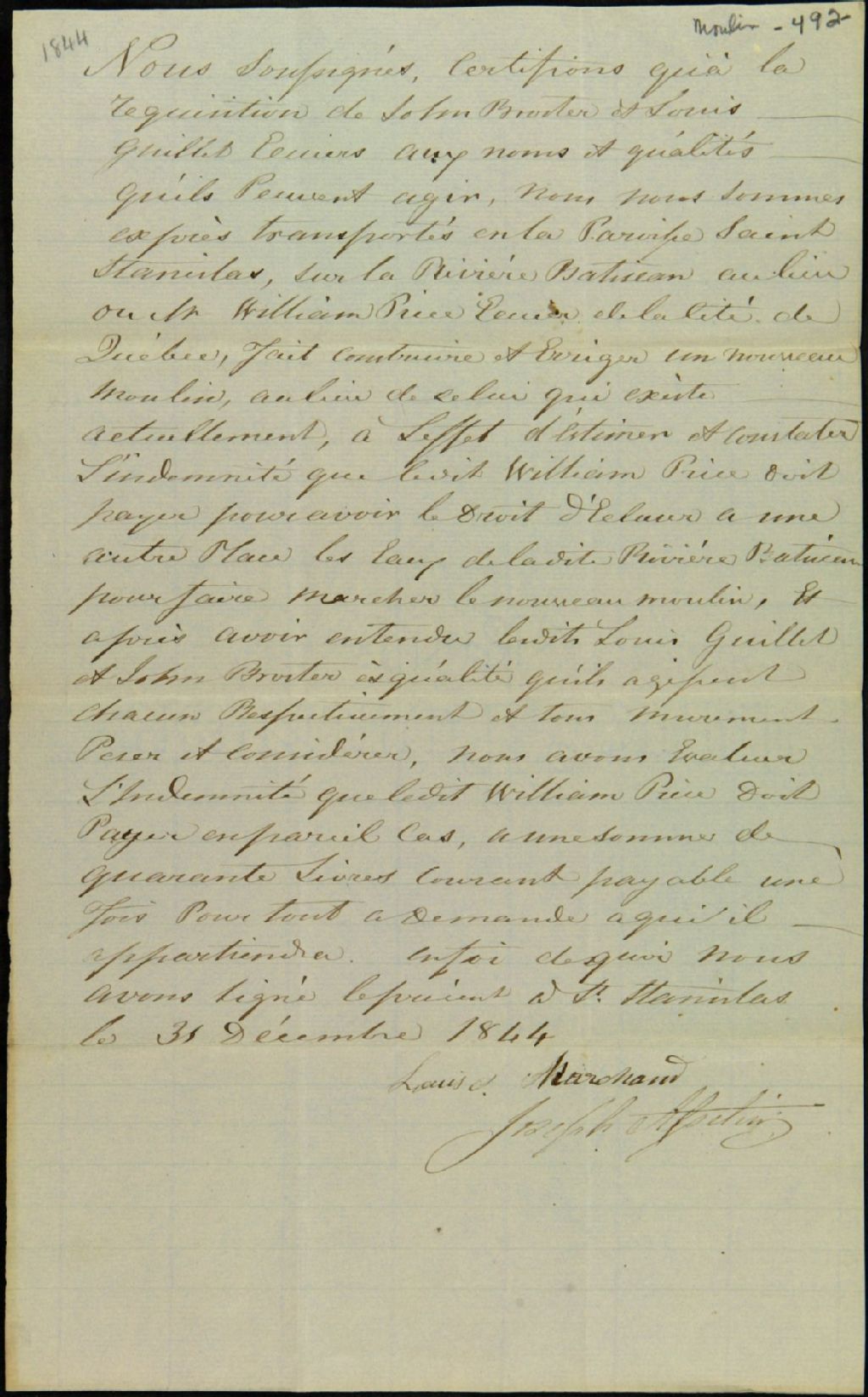 Jugement arbitral pour constater l'indemnité que doit verser William Price pour avoir le droit d'élever les eaux de la rivière Batiscan, paroisse Saint-Stanislas, à la requête de John Broster et Louis Guillet, rédigé par Louis Marchand et Joseph Asselin, 31 décembre 1844, Archives nationales à Québec, Fonds Ministère des Terres et Forêts, (03Q,E21,S64,SS5,SSS10,D492).