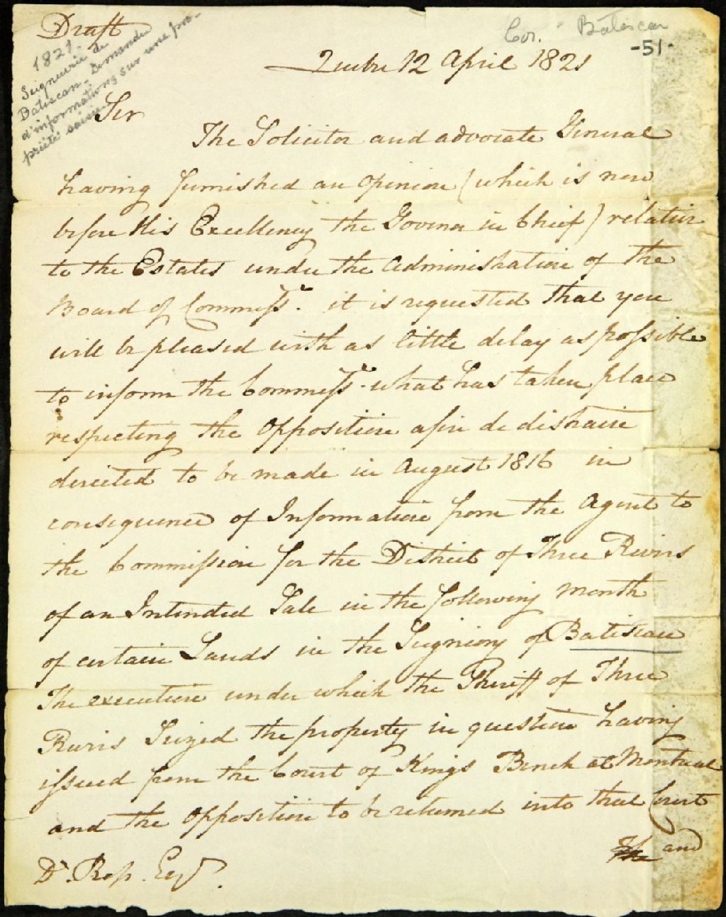 Lettre de Lewis Foy, inspecteur et commissaire des biens des Jésuites, de Québec, à D. Ross, au sujet de la vente par le shérif de Trois-Rivières de certaines propriétés situées dans la seigneurie de Batiscan, 12 avril 1821, Archives nationales à Québec, Fonds Ministère des Terres et Forêts, (03Q,E21,S64,SS5,SSS10,D51).