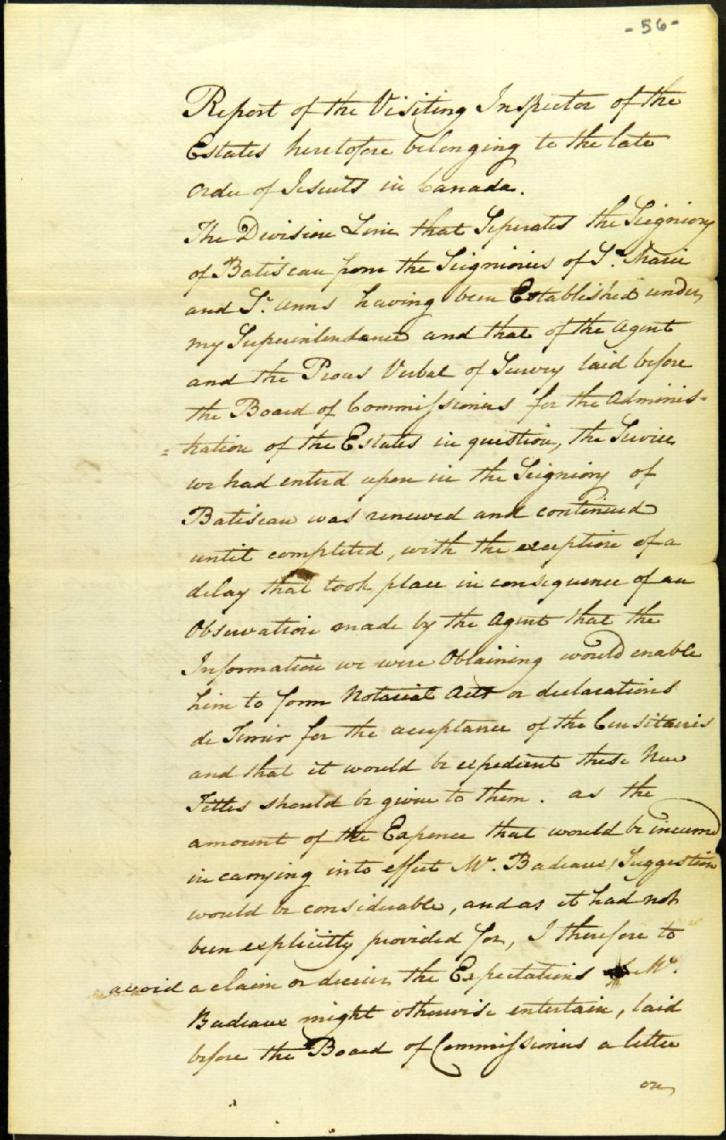 - Rapport de Lewis Foy, inspecteur visiteur des biens des Jésuites, sur la gestion de la seigneurie de Batiscan (lignes de séparation seigneuriale, aveu et dénombrement, arrière-fief accordé à Thomas Coffin et moulin à farine)