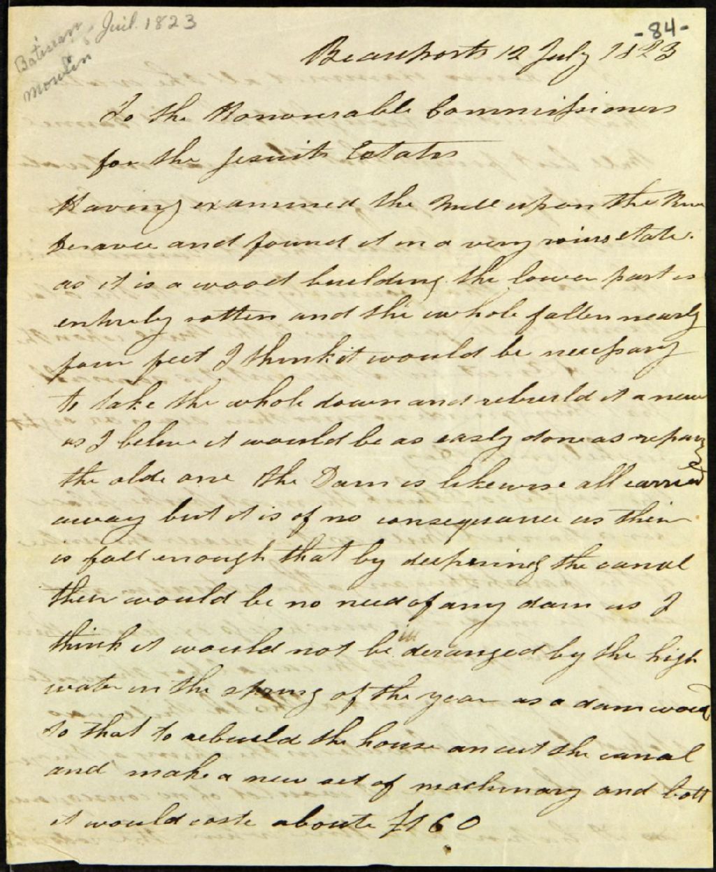Lettre de John Henderson, de Beauport, aux Commissaires des biens des Jésuites, au sujet des réparations à effectuer sur le moulin de la rivière Desavee (des Envies), 12 juillet 1823, Archives nationales à Québec, Fonds Ministère des Terres et Forêts, (03Q,E21,S64,SS5,SSS10,D84).