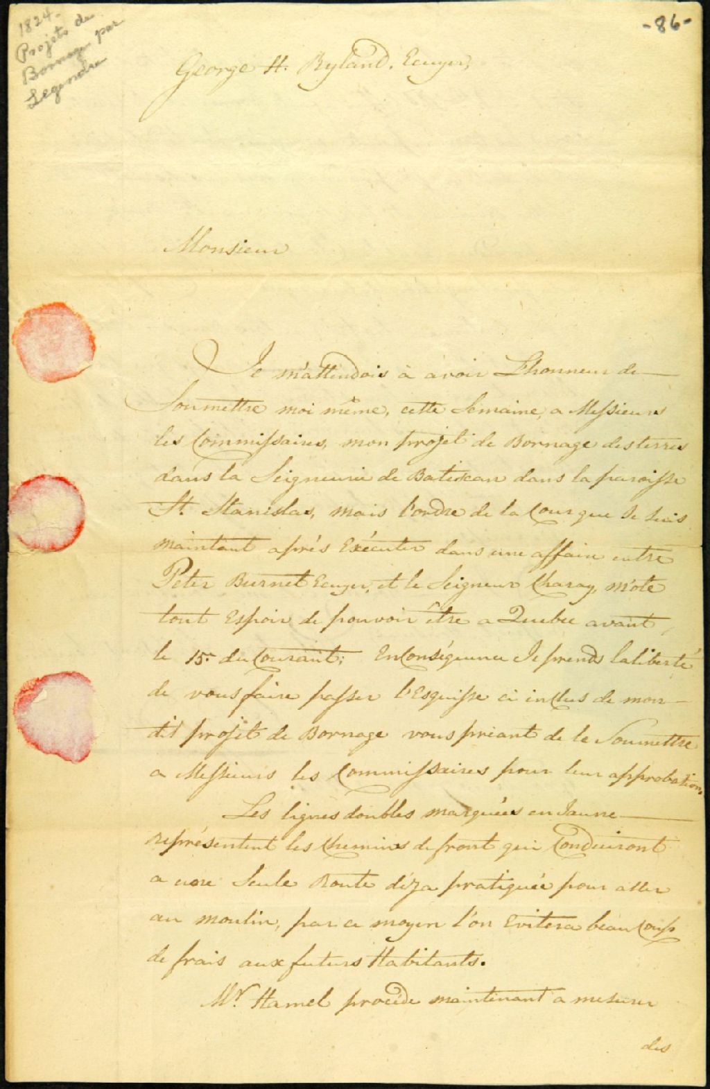 Lettre de Louis Legendre, des Grondines, à George H. Ryland, de Québec, au sujet d'un projet de bornage des terres de la seigneurie de Batiscan dans la paroisse Saint-Stanislas, 7 mars 1824, Archives nationales à Québec, Fonds Ministère des Terres et Forêts, (03Q,E21,S64,SS5,SSS10,D86).
