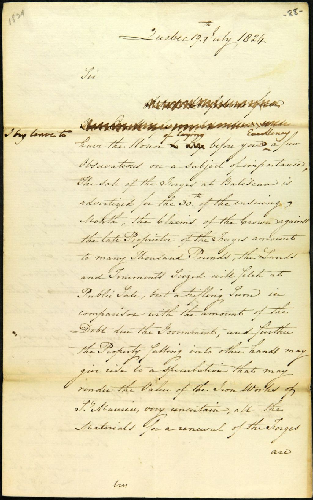 Lettre de Lewis Foy, de Québec, au sujet de la vente des forges de Batiscan, 19 juillet 1824, Archives nationales à Québec, Fonds Ministère des Terres et Forêts, (03Q,E21,S64,SS5,SSS10,D88).