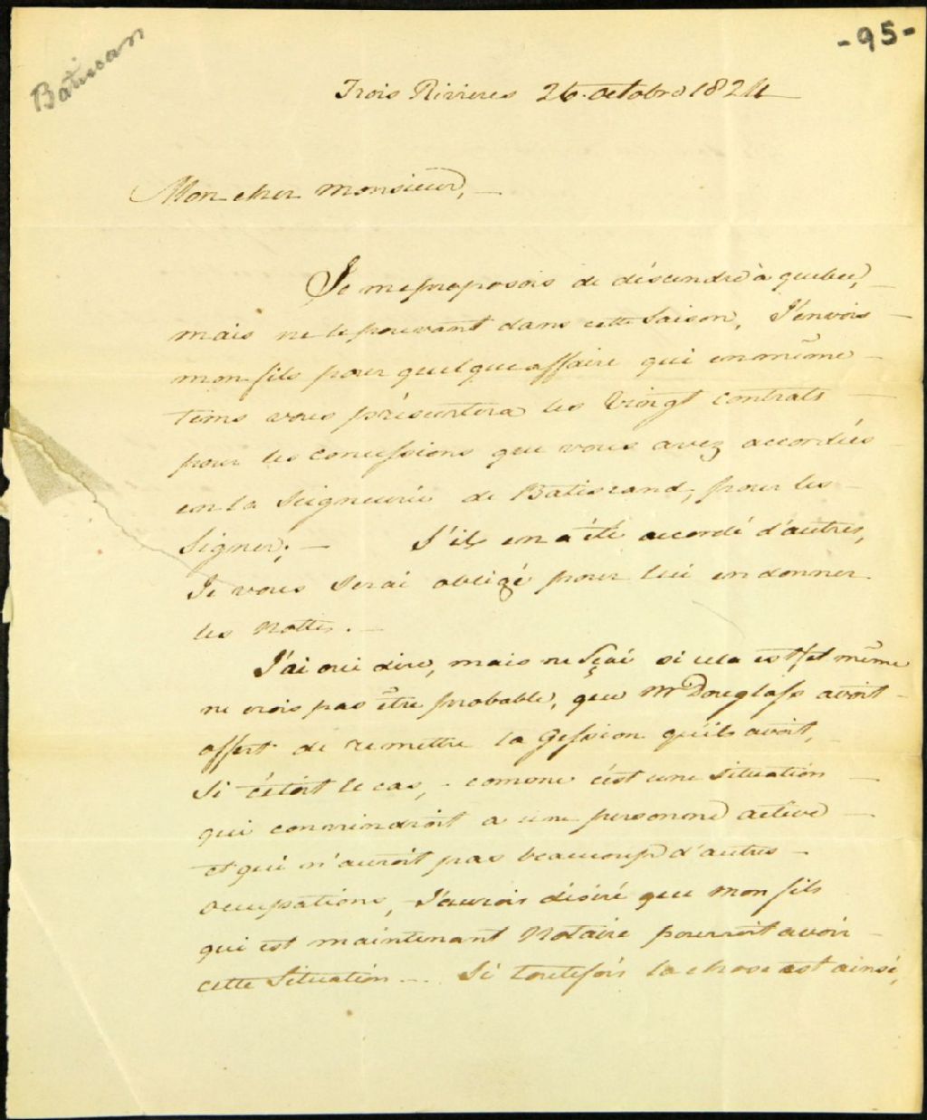 Lettre de Joseph Badeaux, agent des biens des Jésuites pour le district des Trois-Rivières, à Lewis Foy, de Québec, au sujet de la ratification de contrats de concession dans la seigneurie de Batiscan, 26 octobre 1824, Archives nationales à Québec, Fonds Ministère des Terres et Forêts, (03Q,E21,S64,SS5,SSS10,D95).