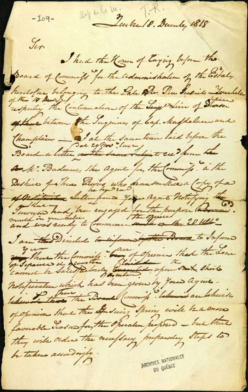 Lettre des Révérends Pères Jésuites, à [David] Munro, concernant la continuation de la ligne entre les seigneuries du Cap-de-la-Madeleine et de Champlain, 18 décembre 1818, Archives nationales à Québec, Fonds Ministère des Terres et Forêts, (03Q,E21,S64,SS5,SSS11,D109).