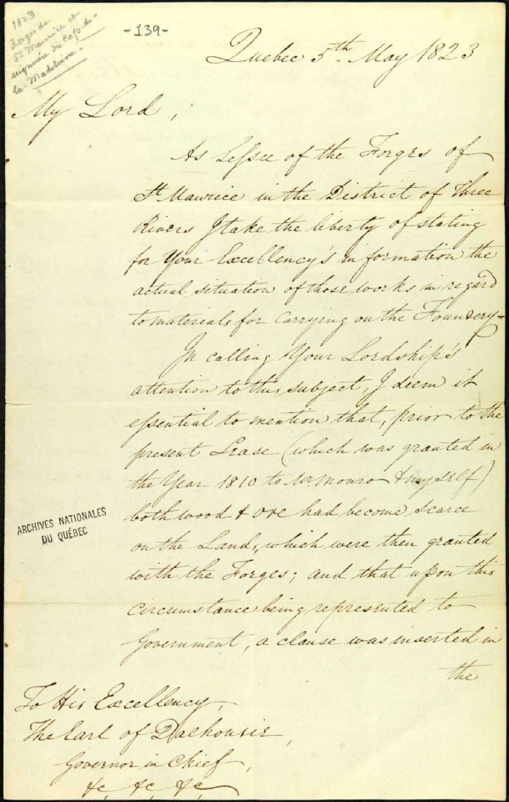 - Lettre de William Bell, à George Ramsay comte Dalhousie, gouverneur en chef, concernant la situation qui prévaut aux Forges du Saint-Maurice
