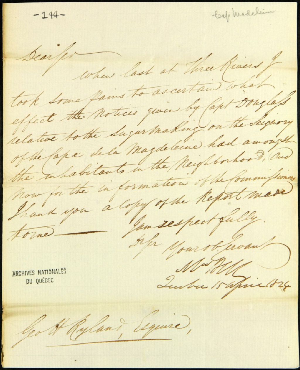 Lettre de William Bell, à George Herman [Witsius] Ryland, écuyer, concernant le respect des domaines des Jésuites du Cap-de-la-Madeleine, 15 avril 1824, Archives nationales à Québec, Fonds Ministère des Terres et Forêts, (03Q,E21,S64,SS5,SSS11,D144).