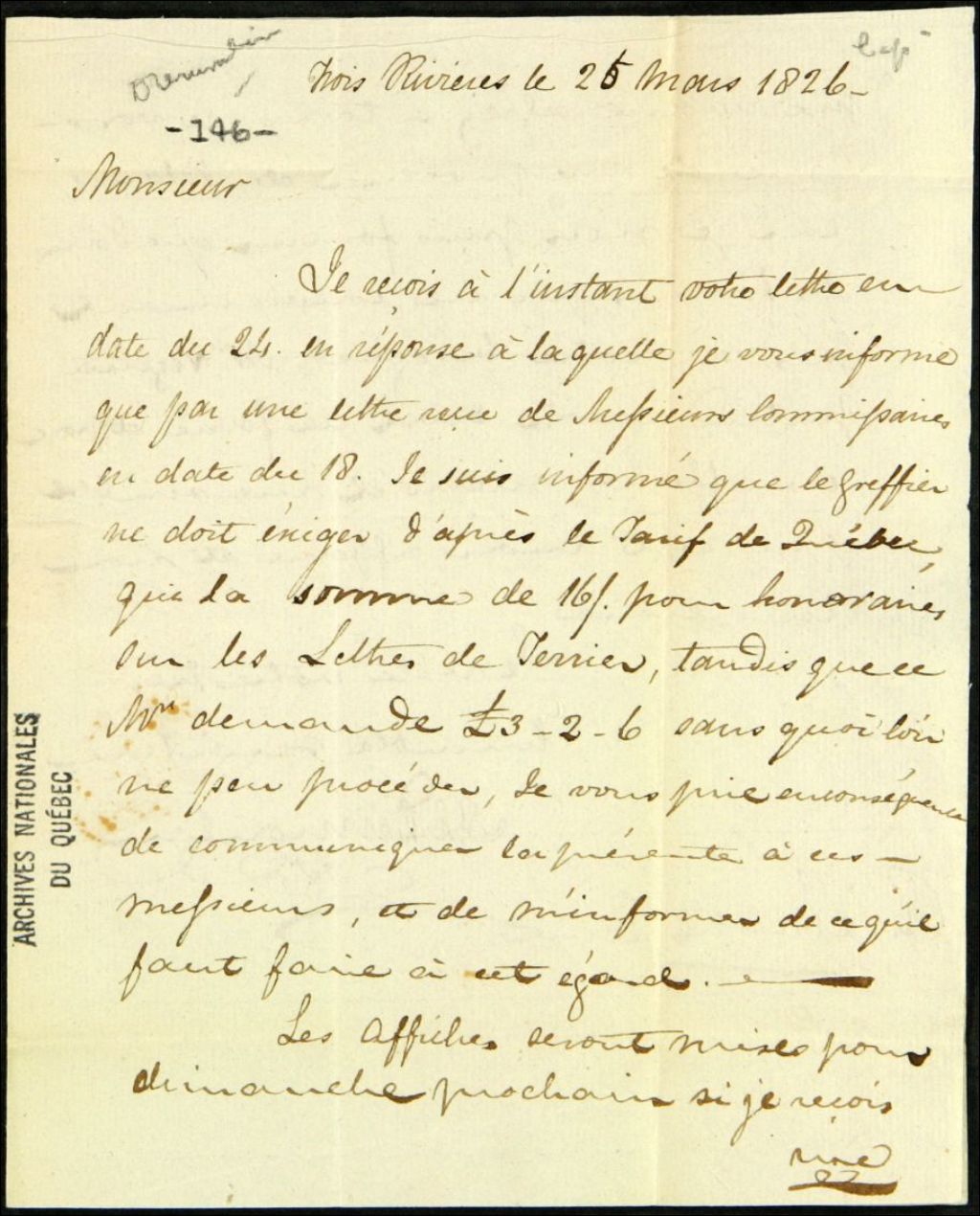 Lettre de Jean-Emmanuel Dumoulin à Robert Christie, écuyer, qu'il informe que le greffier ne doit exiger d'après le tarif de Québec, que la somme de 16 s. [shilling] pour honoraire sur les lettres de terrier, 26 mars 1826, Archives nationales à Québec, Fonds Ministère des Terres et Forêts, (03Q,E21,S64,SS5,SSS11,D146).