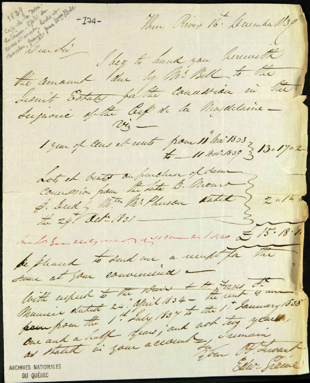 Lettres de comptes pour les cens et rente, lods et ventes, par d'Edward (Grecol/Howe), payés par William Bell, pour la seigneurie du Cap-de-la-Madeleine, 16 décembre 1839, Archives nationales à Québec, Fonds Ministère des Terres et Forêts, (03Q,E21,S64,SS5,SSS11,D174).