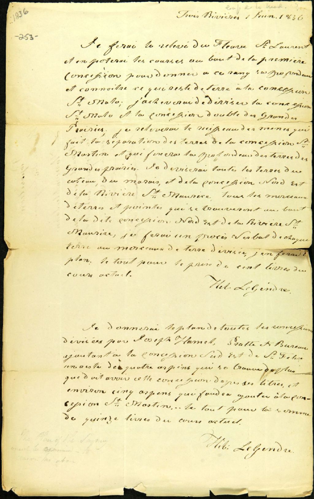 Proposition présentée par Hilarion Legendre, arpenteur, à l'honorable John Stewart, écuyer, membre du Conseil exécutif et législatif, 1er juin 1836, Archives nationales à Québec, Fonds Ministère des Terres et Forêts, (03Q,E21,S64,SS5,SSS11,D253).