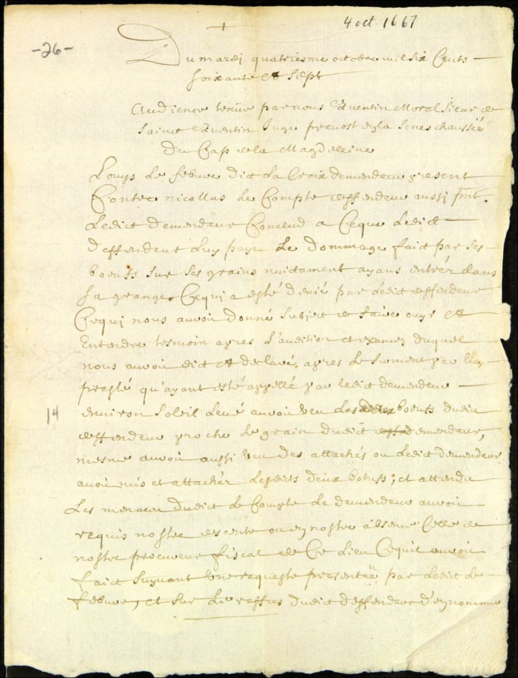 Jugement rendu par Quentin Moral, sieur de Saint-Quentin, juge prévôt de la Sénéchaussée du Cap-de-la-Madeleine, contre Nicolas Lecompte (Lecomte), défendeur, 4 octobre 1667, Archives nationales à Québec, Fonds Ministère des Terres et Forêts, (03Q,E21,S64,SS5,SSS11,D26).