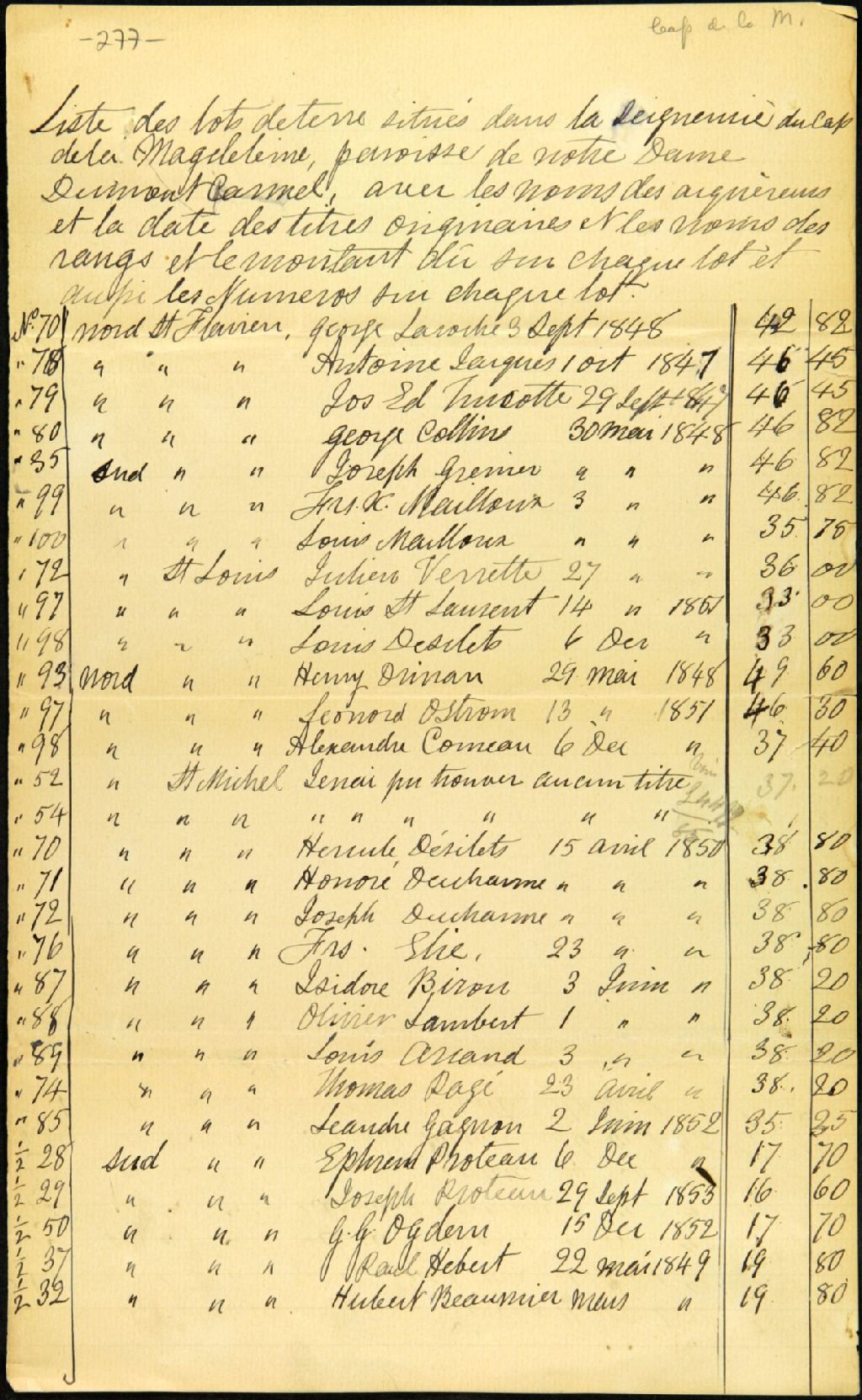Liste des lots de terre dans la seigneurie du Cap-de-la-Madeleine, paroisse Notre-Dame du Mont-Carmel