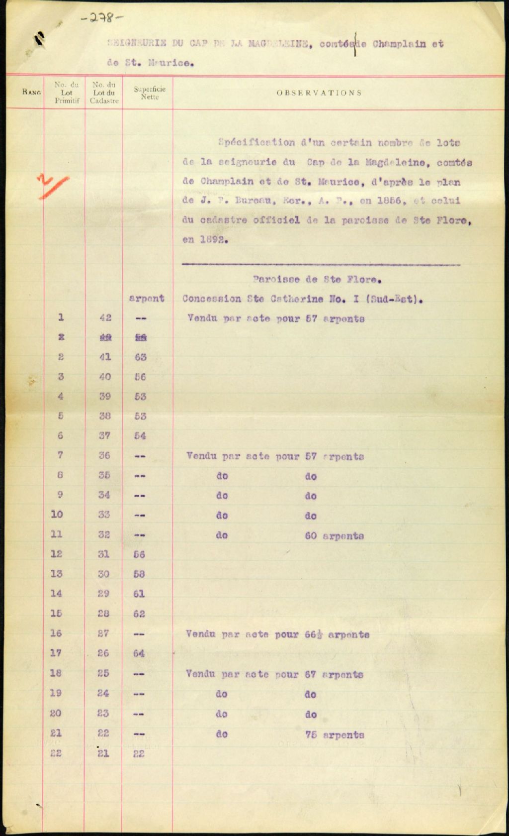 Spécification d'un certain nombre de lots dans la seigneurie du Cap-de-la-Madeleine d'après le plan de J. Bureau en 1856, et celui du cadastre officiel de la paroisse de Sainte-Flore en 1892, par Charles Ed. Gauvin, Surintendant des Arpentages