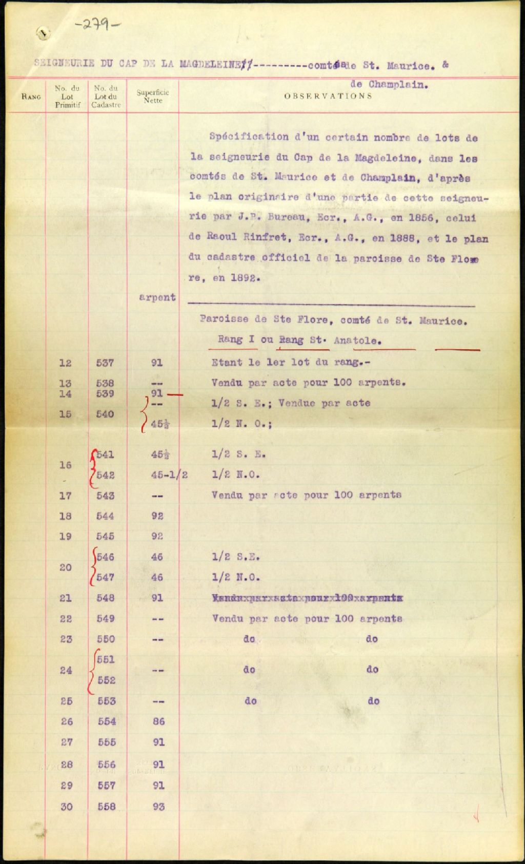 Spécification d'un certain nombre de lots dans la seigneurie du Cap-de-la-Madeleine d'après le plan de J. Bureau en 1856, de Raoul Rinfret en 1888 et celui du cadastre officiel de la paroisse Sainte-Flore en 1892, par Charles Ed. Gauvin, Surintendant des Arpentages