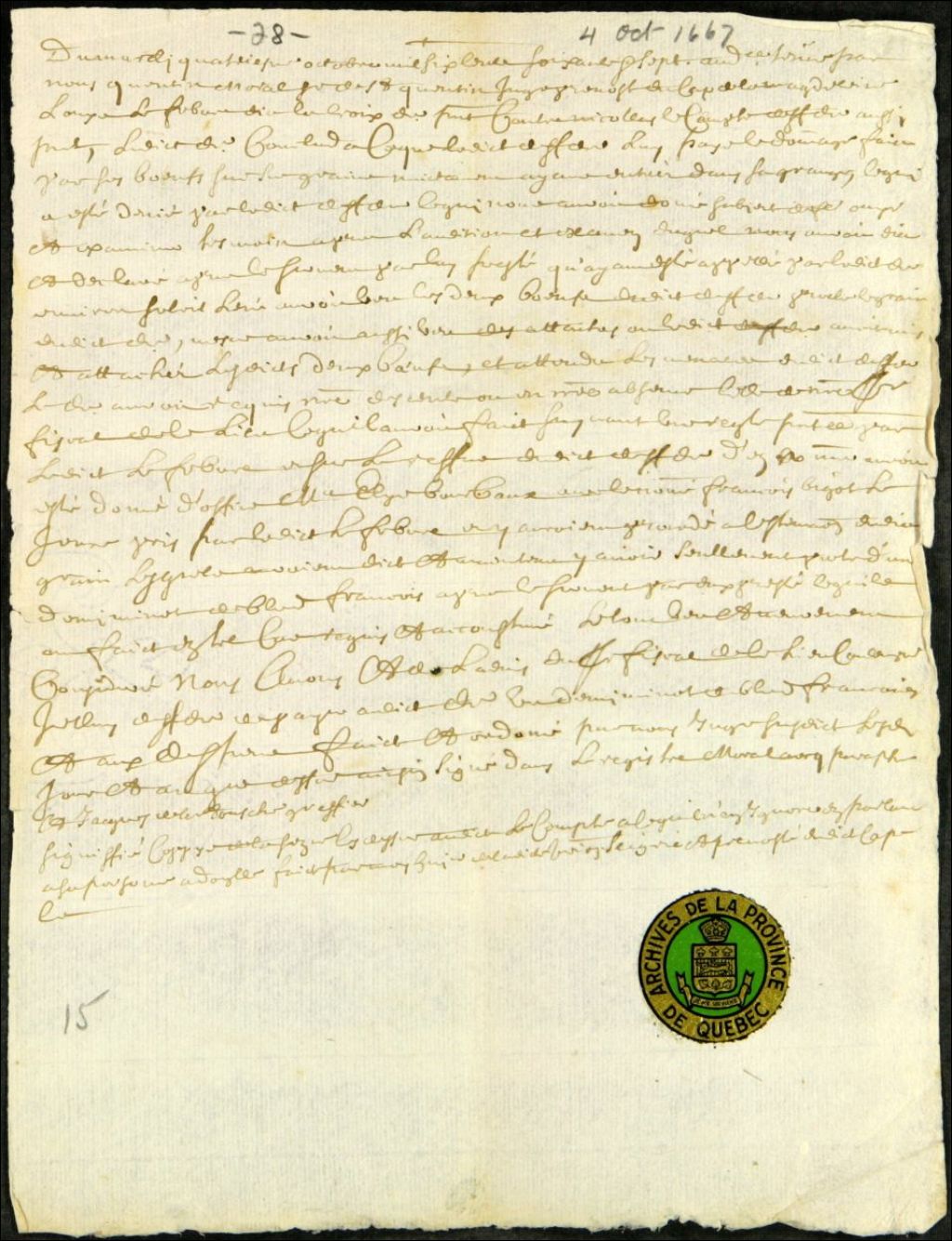 Acte de Quentin Moral, sieur de Saint-Quentin, Sénéchaussée du Cap-de-la-Madeleine, entre Louis Lefebvre dit Lacroix, et Nicolas Lecomte, 4 octobre 1667, Archives nationales à Québec, Fonds Ministère des Terres et Forêts, (03Q,E21,S64,SS5,SSS11,D28).