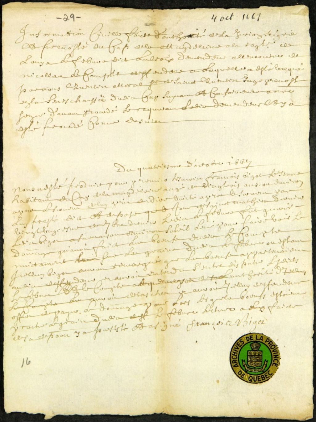 Information entre Louis Lefebvre dit Lacroix, demandeur, et Nicolas Lecompte (Lecomte), par Quentin Moral sieur de Saint-Quentin, de la Sénéchaussée du Cap-de-la-Madeleine, 4 octobre 1667, Archives nationales à Québec, Fonds Ministère des Terres et Forêts, (03Q,E21,S64,SS5,SSS11,D29).