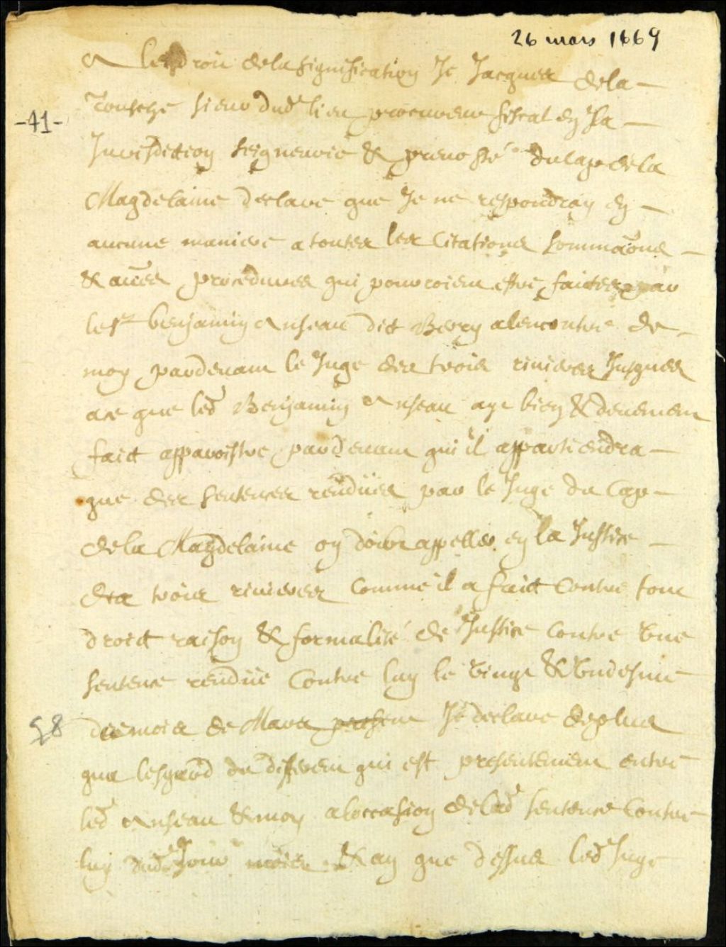 Déclaration de Jacques de La Touche, procureur fiscal de la seigneurie du Cap-de-la-Madeleine, contre l'appel de Benjamin Anceau sieur de Berry, 26 mars 1669, Archives nationales à Québec, Fonds Ministère des Terres et Forêts, (03Q,E21,S64,SS5,SSS11,D41).
