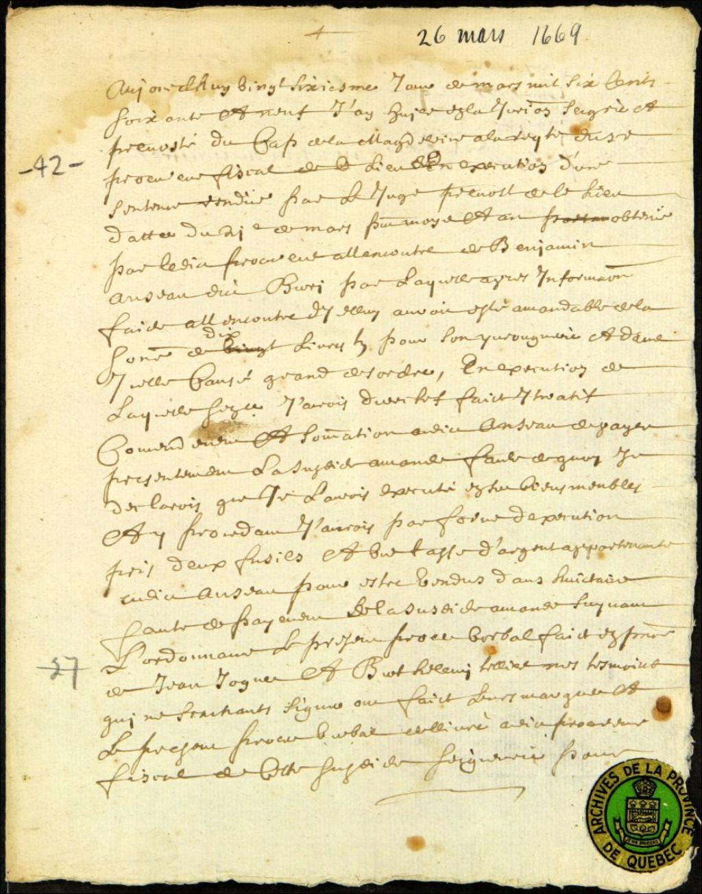 Procès-verbal de saisie chez Benjamin Anceau, sieur de Berry, par la prévôté du Cap-de-la-Madeleine, pour n'avoir pas payé l'amende, 26 mars 1669, Archives nationales à Québec, Fonds Ministère des Terres et Forêts, (03Q,E21,S64,SS5,SSS11,D42).
