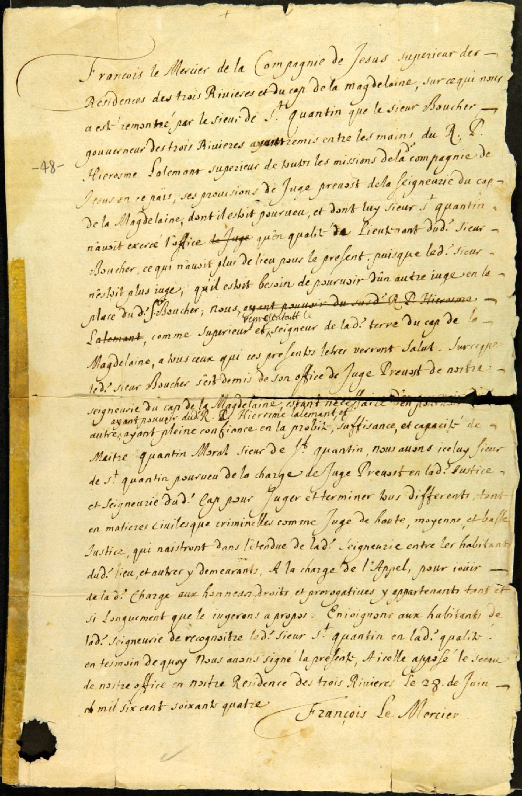 François Lemercier, de la Compagnie de Jésus, supérieur des Révérends Pères des Trois-Rivières, à Quentin Moral sieur de Quentin, juge prévôt de la seigneurie du Cap-de-la-Madeleine, lequel indique que Pierre Boucher s'est démis de son office de juge prévôt de la seigneurie du Cap-de-la-Madeleine et que les Jésuites ont pleinement confiance en le sieur Moral Quentin, sieur de Saint-Quentin