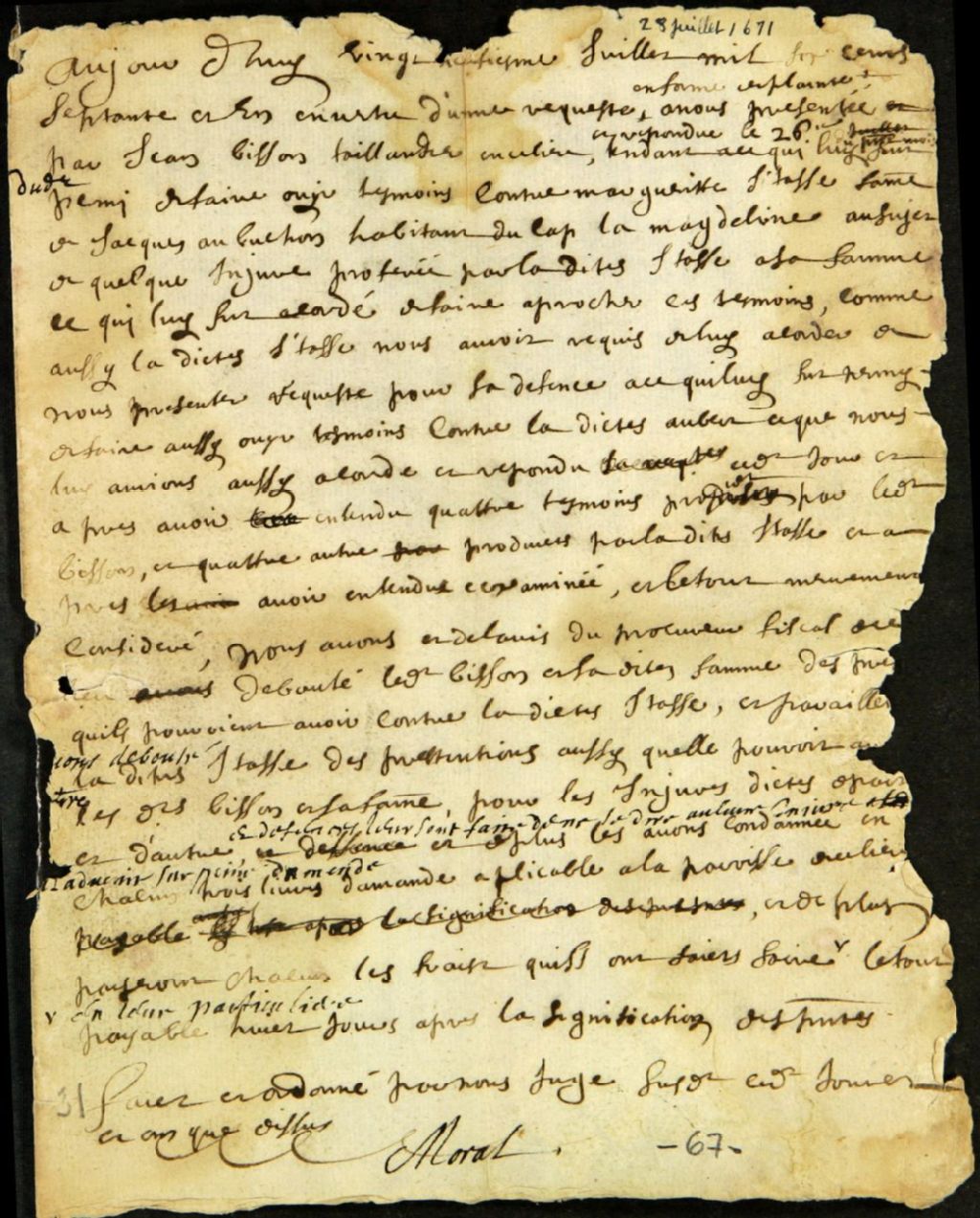 Jugement rendu par Quentin Moral sieur de Quentin, déboutant Jean Bisson (ou Buisson dit Provençal), taillandier, et sa femme, de leur plainte contre Marguerite Itasse (Itas), épouse de Jacques Aubuchon, habitant du Cap-de-la-Madeleine