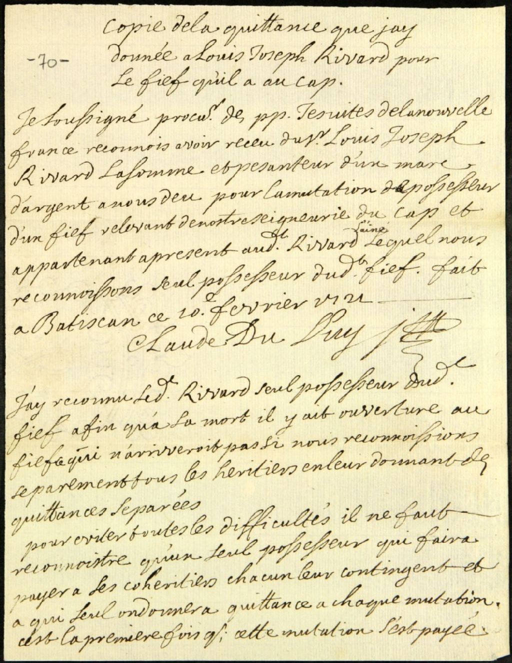 Copie d'une quittance donnée à Louis Joseph Rivard (l'aîné), pour mutation de fief au Cap-de-la-Madeleine par Claude Dupuy, procureur des Révérends Pères Jésuites de la Nouvelle-France, 10 février 1721, Archives nationales à Québec, Fonds Ministère des Terres et Forêts, (03Q,E21,S64,SS5,SSS11,D70).
