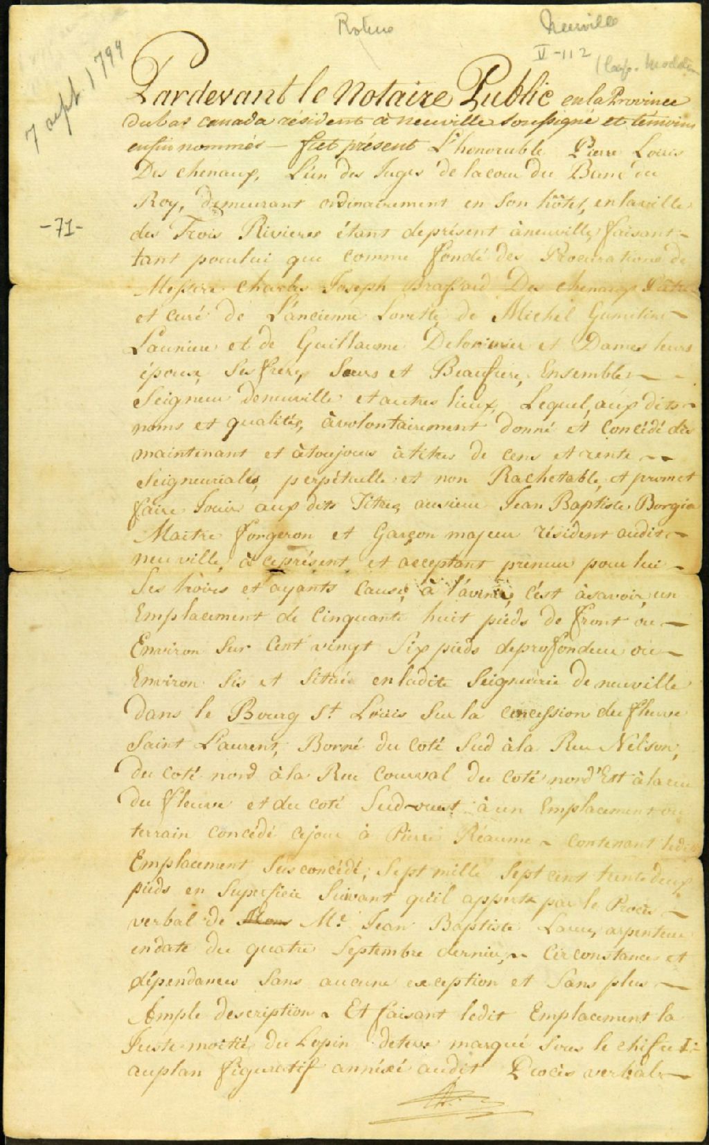 Concession d'un emplacement accordée par Pierre-Louis Deschenaux, juge de la cour du Banc du Roi, demeurant ordinairement en son hôtel en la ville de Trois-Rivières, et présent à Neuville, fondé de procuration de messire Charles-Joseph Brassard Deschenaux, prêtre et curé de l'Ancienne Lorette, de Michel Gamelin Launière, et de Guillaume Delorimier, et dames leurs épouses, à Jean-Baptiste Borgia, maître forgeron, garçon majeur, résident à Neuville dans le Bourg Saint-Louis, 7 septembre 1799, Archives nationales à Québec, Fonds Ministère des Terres et Forêts, (03Q,E21,S64,SS5,SSS11,D71).
