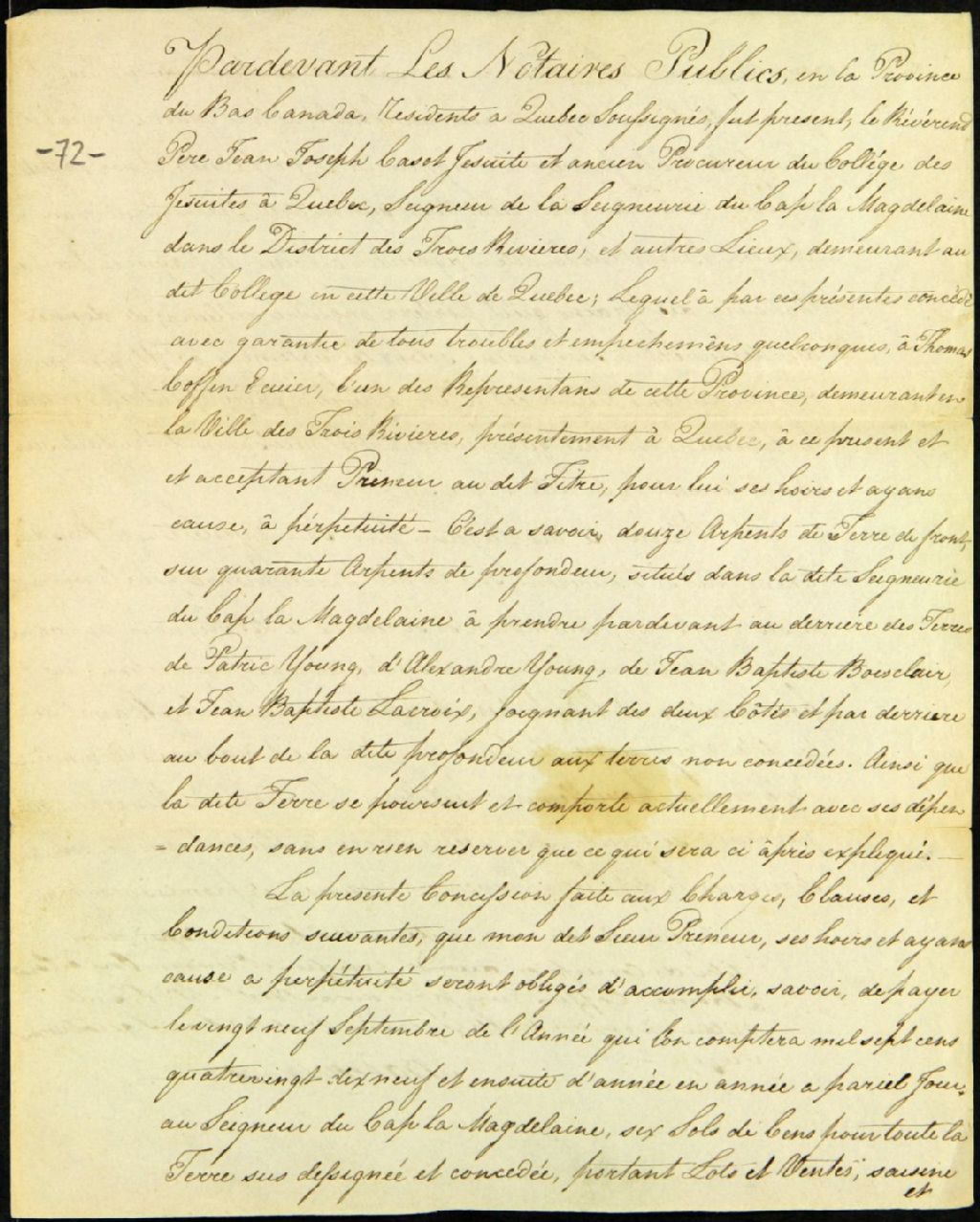 Concession accordée par le Révérend Père Joseph Casot, Jésuite, et ancien procureur du collège des Jésuites à Québec, seigneur de la seigneurie du Cap-de-la-Madeleine, à Thomas Coffin (Collin/Colin) écuyer, l'un des représentants de cette province, demeurant à Trois-Rivières