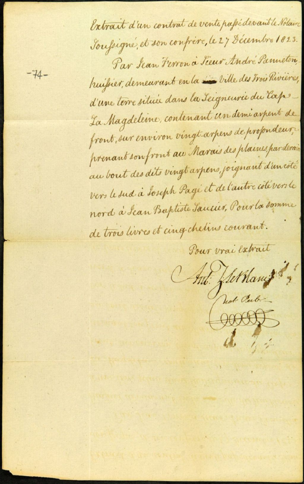 Vente par Jean Ferron à sieur André Panneton, huissier demeurant à Trois-Rivières, d'une terre située dans la seigneurie du Cap-de-la-Madeleine, contenant ½ arpent de front, sur environ 20 arpents de profondeur, 27 décembre 1823, Archives nationales à Québec, Fonds Ministère des Terres et Forêts, (03Q,E21,S64,SS5,SSS11,D74).