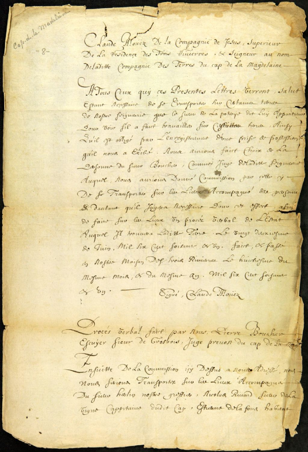 Demande du père Claude Allouez, supérieur de la Compagnie de Jésus aux Trois-Rivières, au sieur Pierre Boucher, juge prévôt, de la dite seigneurie, de se rendre sur les terres du sieur Jacques de LaPoterie et d'en vérifier l'état
