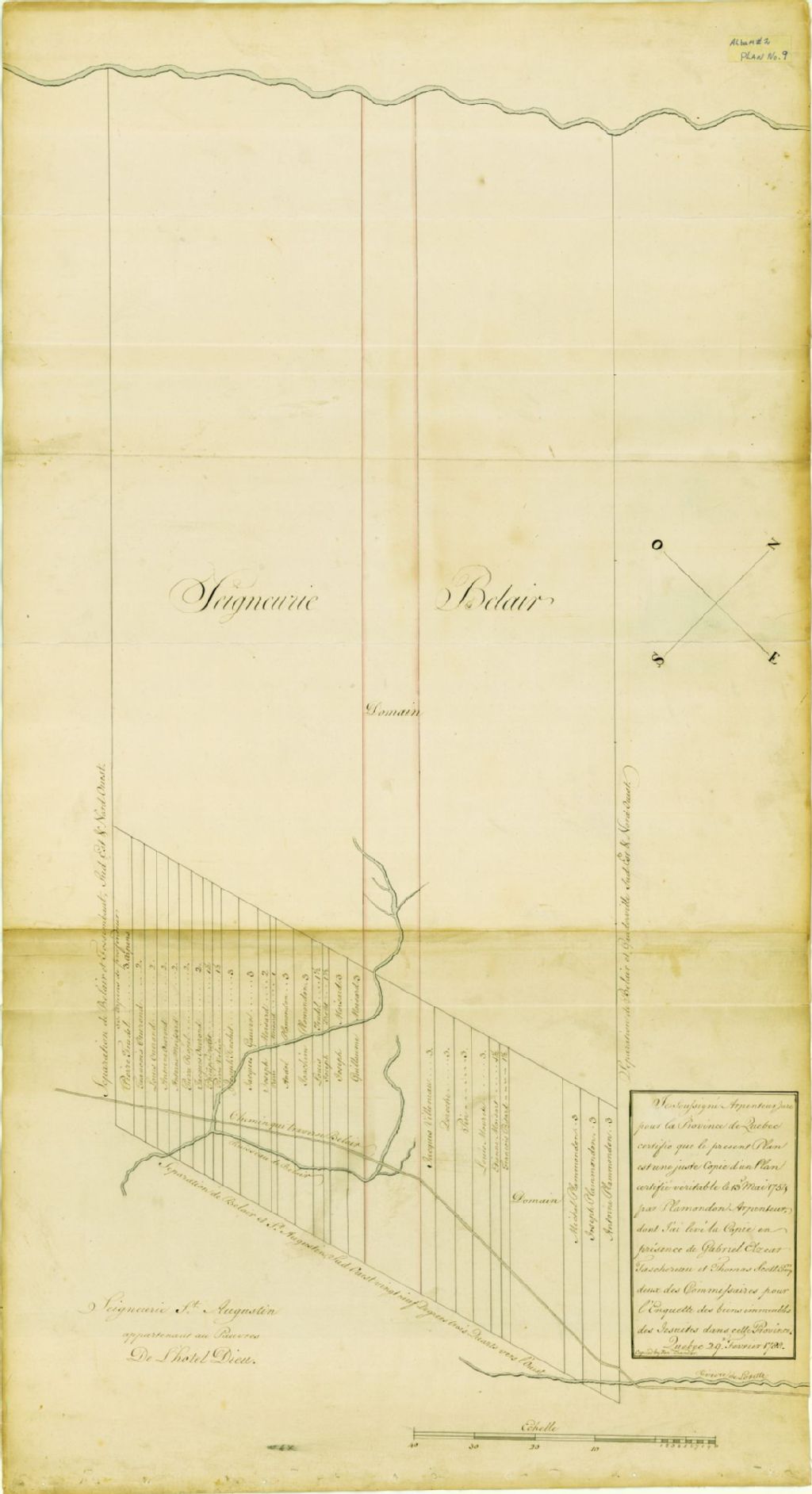 Sur ce plan de la seigneurie de Bélair figurent la rivière Bélair, la dimenson des lots, les routes, les domaines, le terrain des Jésuites et le nom des propriétaires