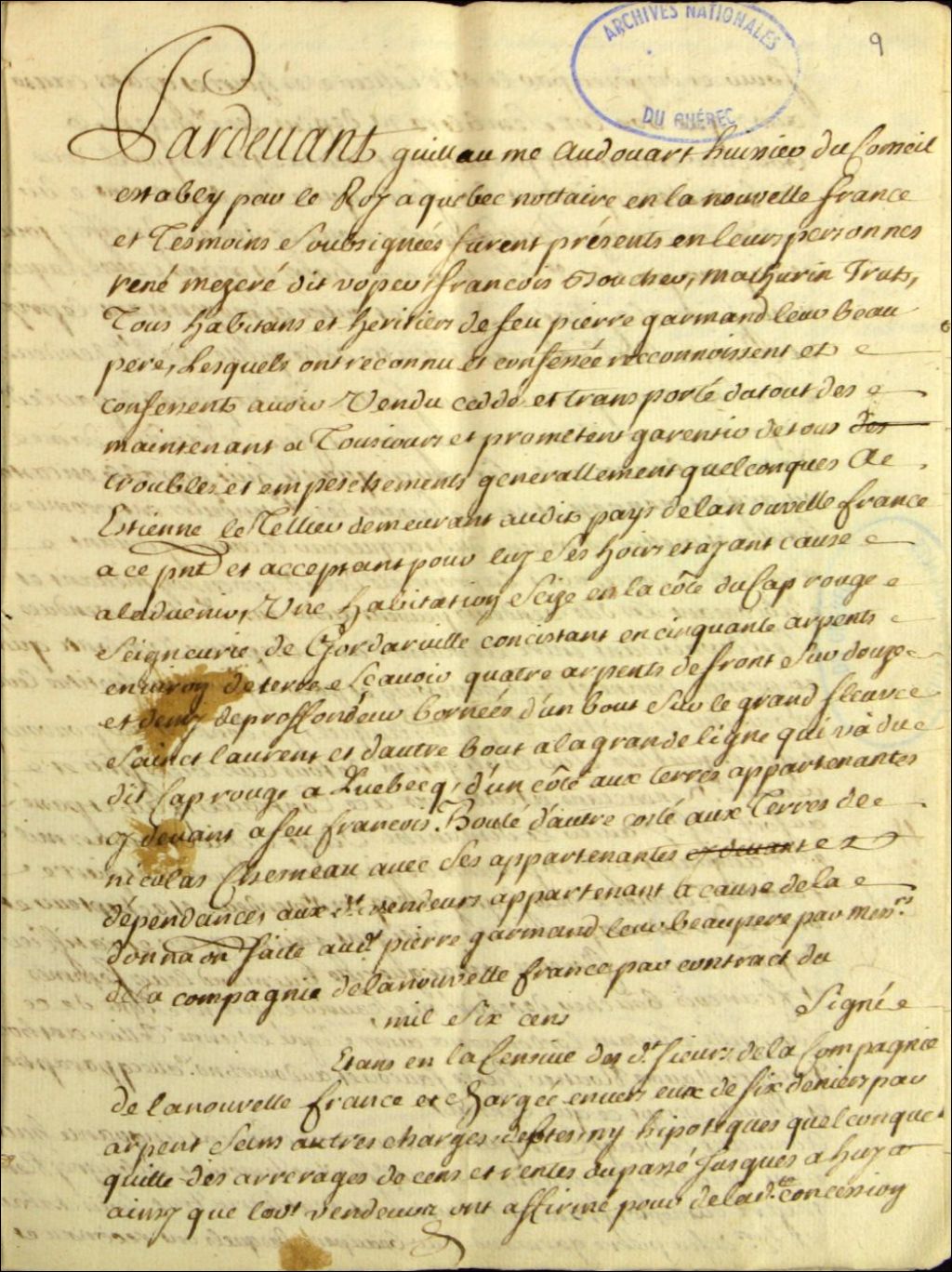 Copie du contrat de vente d'une habitation sise dans la côte du Cap-Rouge, dans la seigneurie de Godarville (Gaudarville), par René Mezeray dit Nopces, François Boucher et Mathurin Trut (Tru, Trud), tous habitants et héritiers du défunt Pierre Gareman, leur beau-père, à Étienne Letellier (Tellier), demeurant en la Nouvelle-France, par-devant Guillaume Audouart, huissier au Conseil établi par le Roi à Québec, notaire
