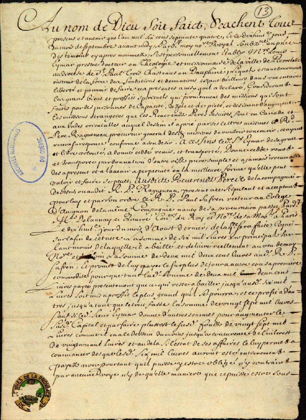 Donation entre vifs de la somme de six mille livres en principal par messire Louis Émard (Eymar, Eymard, Haimard), prêtre, docteur en théologie et missionnaire de la ville de Pierrelate, au diocèse de Saint-Paul-Trois-Châteaux en Dauphiné, aux Révérends Pères de la Compagnie de Jésus, comparant par le Révérend Père Paul Ragueneau, procureur général des missions de ladite Compagnie, par-devant Maurice Marin, notaire royal de la ville d'Aubénar (?)