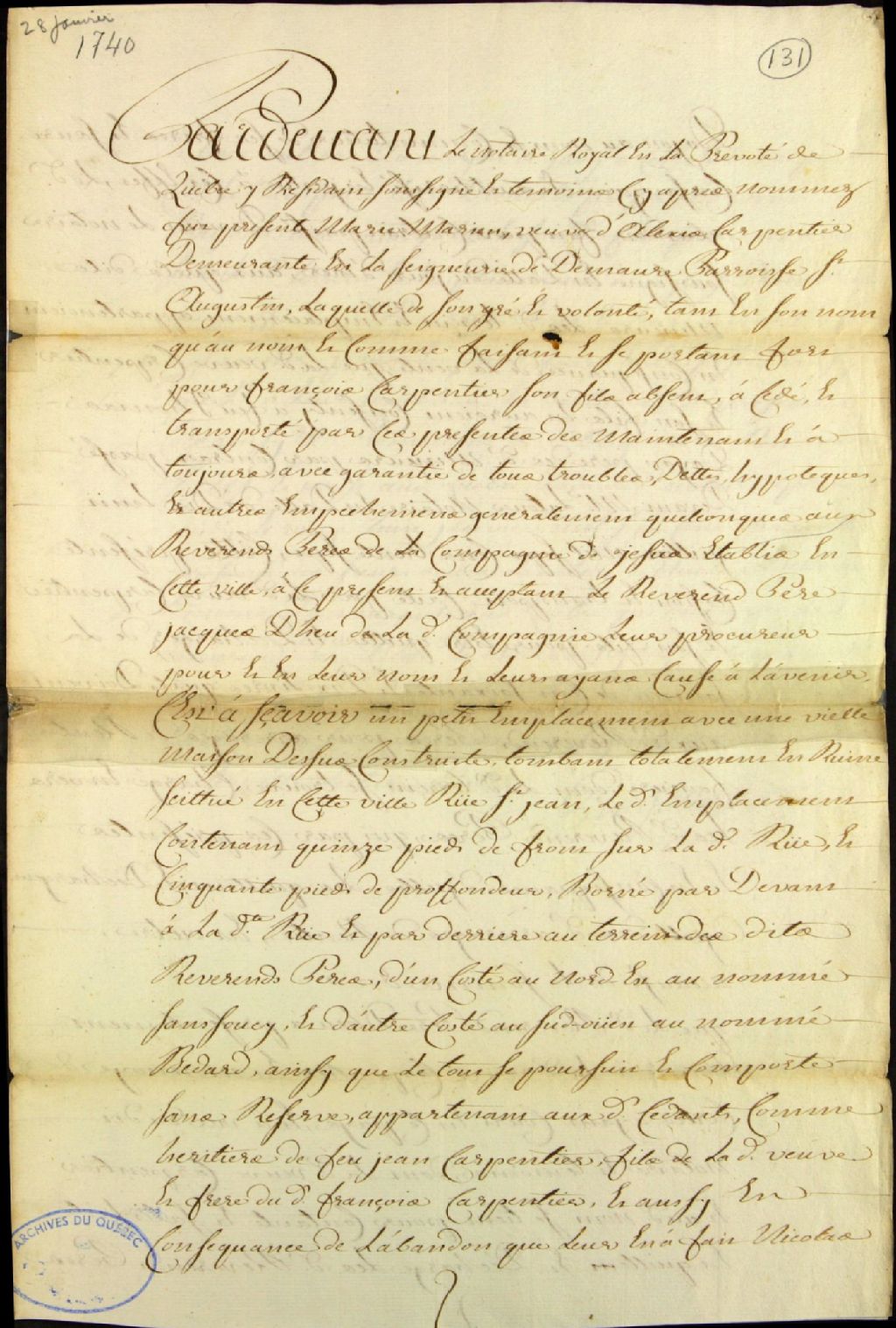 Cession et transport d'un petit emplacement, situé rue Saint-Jean à Québec, avec une vieille maison construite dessus tombant totalement en ruine, par Marie Marien, veuve d'Alexis Carpentier, demeurant en la seigneurie de Demaure (de Maure, Desmaures), paroisse de Saint-Augustin, faisant tant en son nom que pour François Carpentier, son fils absent, en faveur des Révérends Pères Jésuites, acceptant par le Révérend Père Jacques Dheu (d'Heu), leur procureur, par-devant Pinguet, notaire royal en la Prévôté de Québec, et en présence des sieurs Louis Lambert et Nicolas Bellevue, témoins, demeurant audit Québec