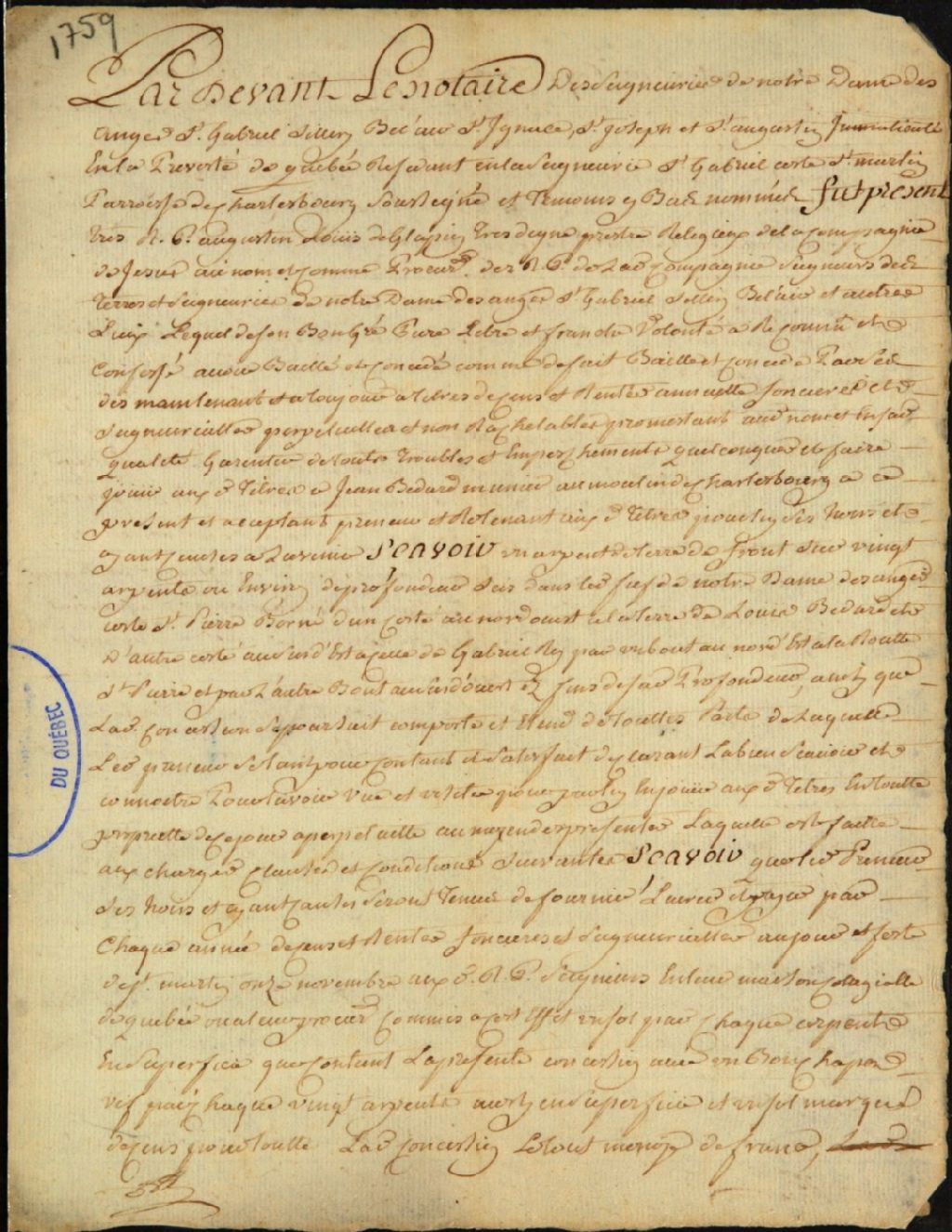Acte de concession d'un arpent de terre de front sur environ vingt arpents de profondeur dans la côte Saint-Pierre, dans le fief de Notre-Dame-des-Anges, à Jean Bédard, meunier au moulin de Charlesbourg, par le très Révérend Père Augustin-Louis de Glapion, très digne prêtre et religieux de la Compagnie de Jésus, au nom et comme procureur des Révérends Pères de ladite Compagnie, seigneurs des terres et seigneuries de Notre-Dame-des-Anges, Saint-Gabriel, Sillery, Bélair et autre lieux, par-devant Geneste (Genest), notaire desdites seigneuries, immatriculé en la Prévôté de Québec, résidant dans la côte Saint-Martin, en la seigneurie de Saint-Gabriel