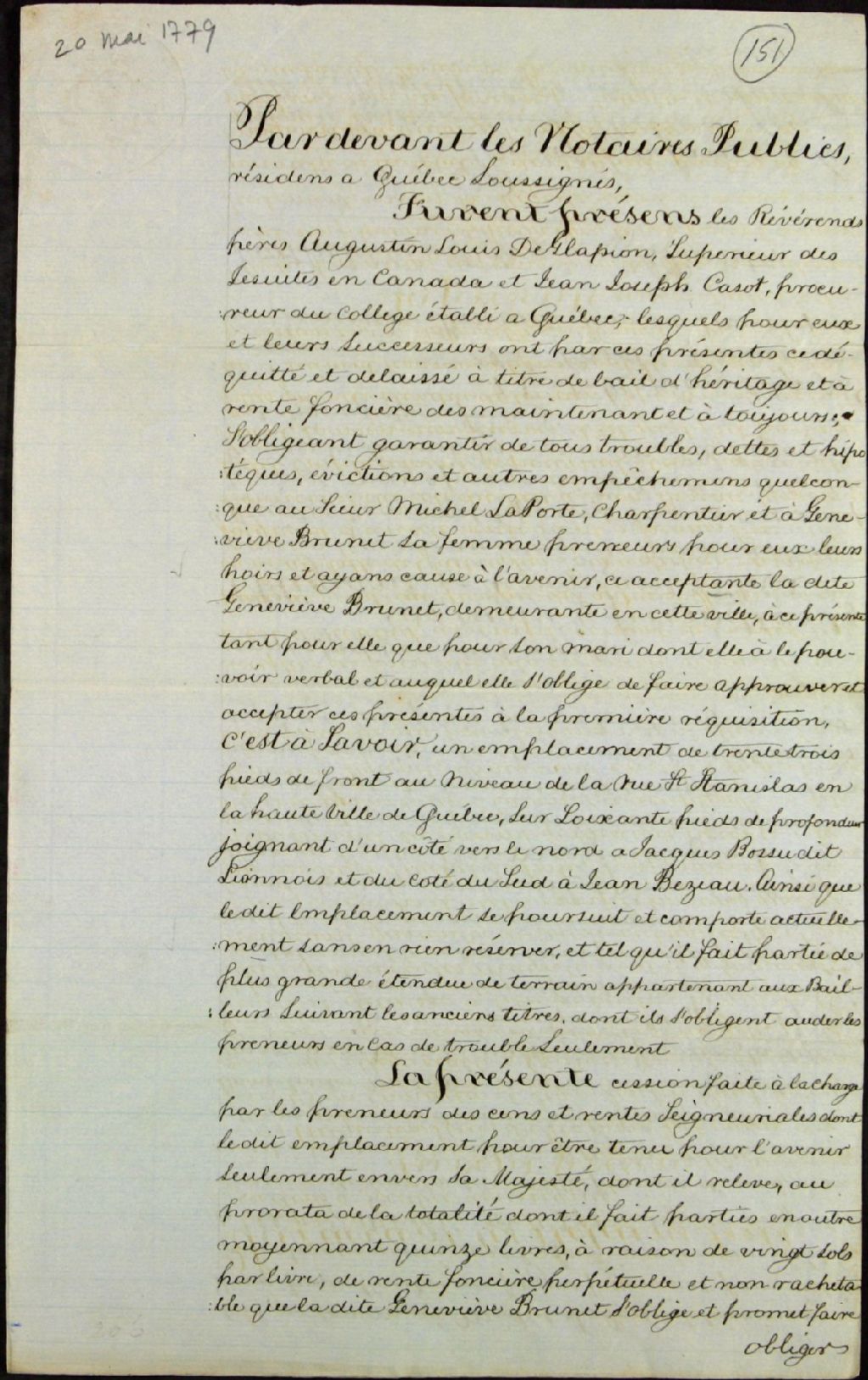 Cession d'un emplacement de trente-trois pieds de front au niveau de la rue Saint-Stanislas, en la Haute-Ville de Québec, sur soixante pieds de profondeur, au sieur Michel Laporte, charpentier, et à Geneviève Brunet, sa femme, par les Révérends Pères Augustin-Louis de Glapion, supérieur des Jésuites au Canada, et Jean-Joseph Casot, procureur de leur collège établi à Québec, par-devant Berthelot Dartigny et Panet, notaires publics
