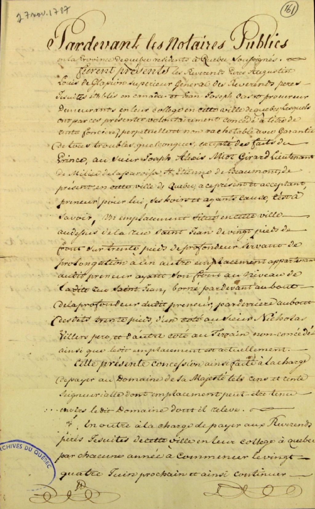 Acte de concession d'un emplacement situé au-dessus de la rue Saint-Jean en la ville de Québec au sieur Joseph-Alexis Miot Girard, lieutenant de milice de la paroisse de Saint-Étienne-de-Beaumont, par les Révérends Pères Augustin-Louis de Glapion, supérieur général des Révérends Pères Jésuites du Canada, et Jean-Joseph Casot, procureur, demeurant au collège de Québec, par-devant Jacques Pinguet et Louis Deschenaux, notaires publics en la province de Québec, 27 novembre 1787, Archives nationales à Québec, Fonds Ministère des Terres et Forêts, (03Q,E21,S64,SS5,SSS1,D161).