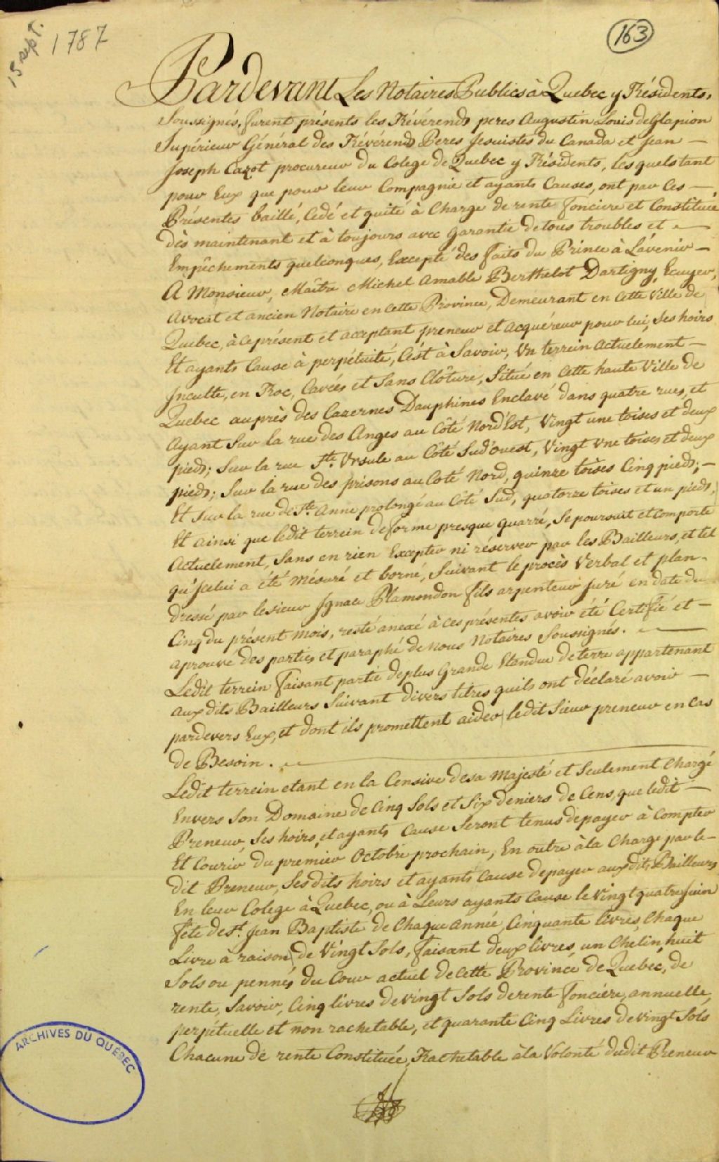 Cession d'un terrain actuellement inculte, en roc, cavées et sans clôture, situé près des casernes Dauphines en la Haute-Ville de Québec et enclavé dans quatre rues, à monsieur maître Michel-Amable Berthelot Dartigny, écuyer, avocat et ancien notaire en la province de Québec, par les Révérends Pères Augustin-Louis de Glapion, supérieur général des Révérends Pères Jésuites du Canada, et Jean-Joseph Casot, procureur du collège de Québec, faisant tant pour eux que pour leur Compagnie, par-devant Jacques Pinguet, notaire public