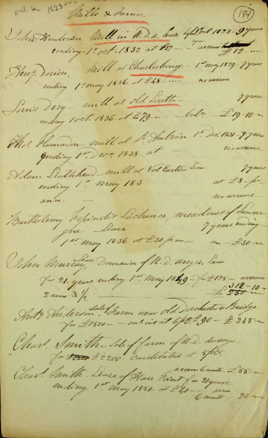 Recensement sommaire de concessionnaires de moulins et de fermes ayant appartenu aux Jésuites, 1er octobre 1823 - 1er octobre 1832, Archives nationales à Québec, Fonds Ministère des Terres et Forêts, (03Q,E21,S64,SS5,SSS1,D184).