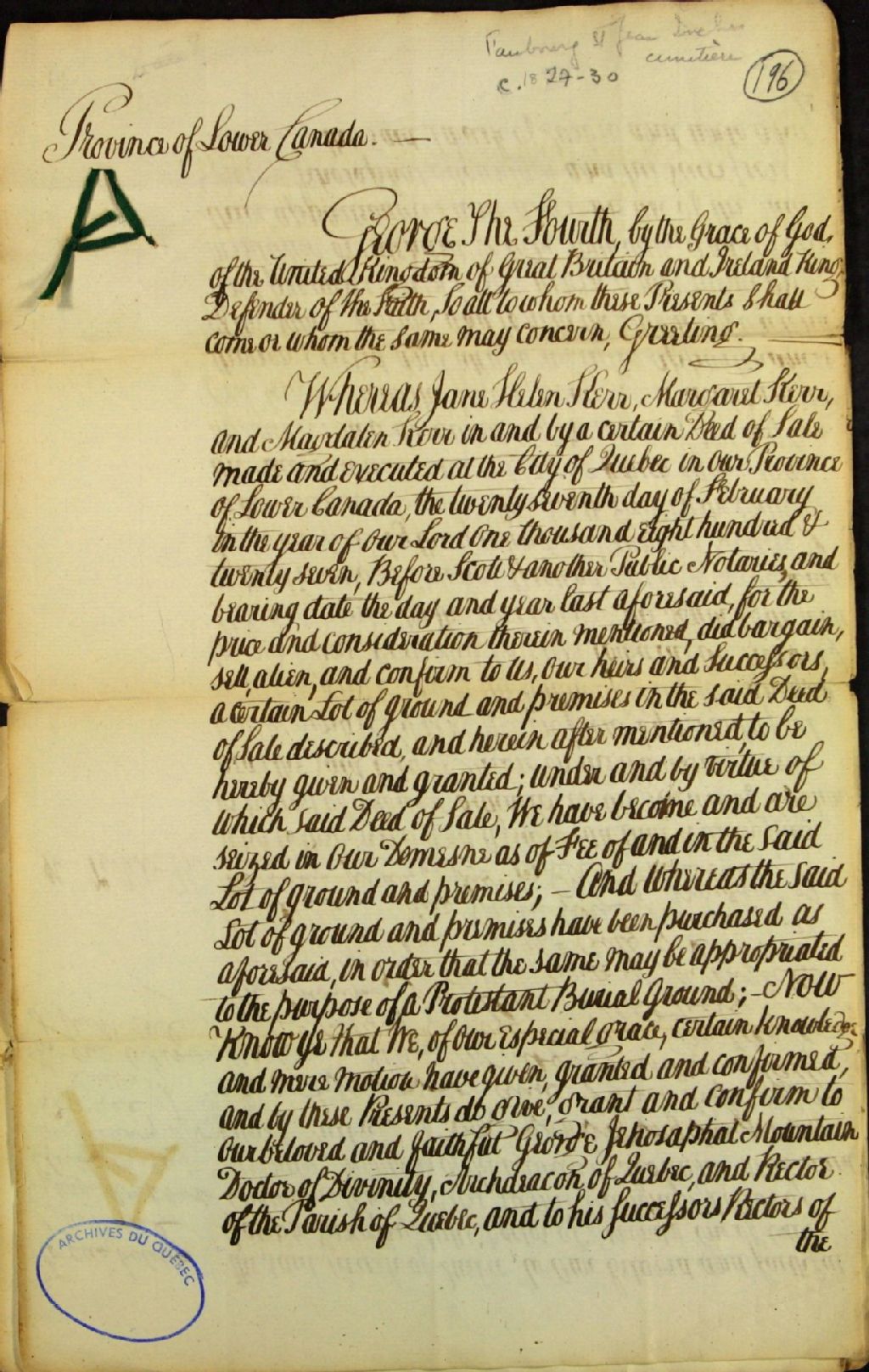 Lettres patentes de George IV, par la grâce de Dieu Roi du Royaume-Uni de Grande-Bretagne et d'Irlande, défenseur de la Foi, par lesquelles il concède à George Jehosaphat (Jehoshaphat) Mountain, docteur (doctor of divinity), archidiacre de Québec et recteur de la paroisse de Québec, et à ses successeurs recteurs de ladite paroisse, à Joseph Langley Mills, docteur (doctor of divinity), l'un des chapelains du Roi, et à James Harkness, docteur (doctor of divinity), ministre de l'Église d'Écosse à Québec, entre autres, une terre située dans le faubourg Saint-Jean près de Québec, dans ladite paroisse de Québec