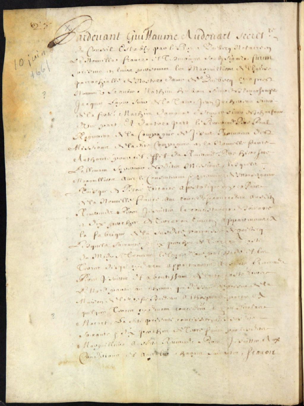 Acte de concession d'une terre appartenant à la Fabrique de la paroisse de Notre-Dame-de-Québec par Mathieu Hubou, sieur Deslongschamps, Jacques Loyer, sieur de LaTour, Jean Juchereau, sieur de LaFerté et Mathieu Damours, sieur de Chaufours, marguilliers de ladite paroisse, aux Révérends Pères de la Compagnie de Jésus, comparant par le Révérend Père Paul Ragueneau, procureur des missions de ladite Compagnie en Nouvelle France, par-devant Guillaume Audouart, secrétaire du Conseil établi par le Roi à Québec, notaire
