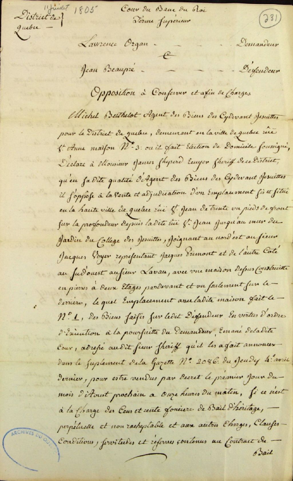 Déclaration de Michel Berthelot, agent des biens ayant appartenu aux Jésuites pour le District de Québec, demeurant dans la maison numéro trois, sur la rue Sainte-Anne en la ville de Québec, à monsieur James Sheperd (Shepherd, Sheppard), écuyer, shérif dudit District, à l'effet qu'il s'oppose à la vente et adjudication de l'emplacement situé sur la rue Saint-Jean en la Haute-Ville de Québec, avec une maison en pierre de deux étages devant et un seulement derrière construite dessus, saisi sur Jean Beaupré, défendeur, à la suite de la poursuite intentée contre lui par Lawrence Organ, demandeur, et ce, jusqu'à ce que ledit Berthelot soit payé pour des arrérages de cens, rentes foncières et autres droits, devant la Cour du Banc du Roi