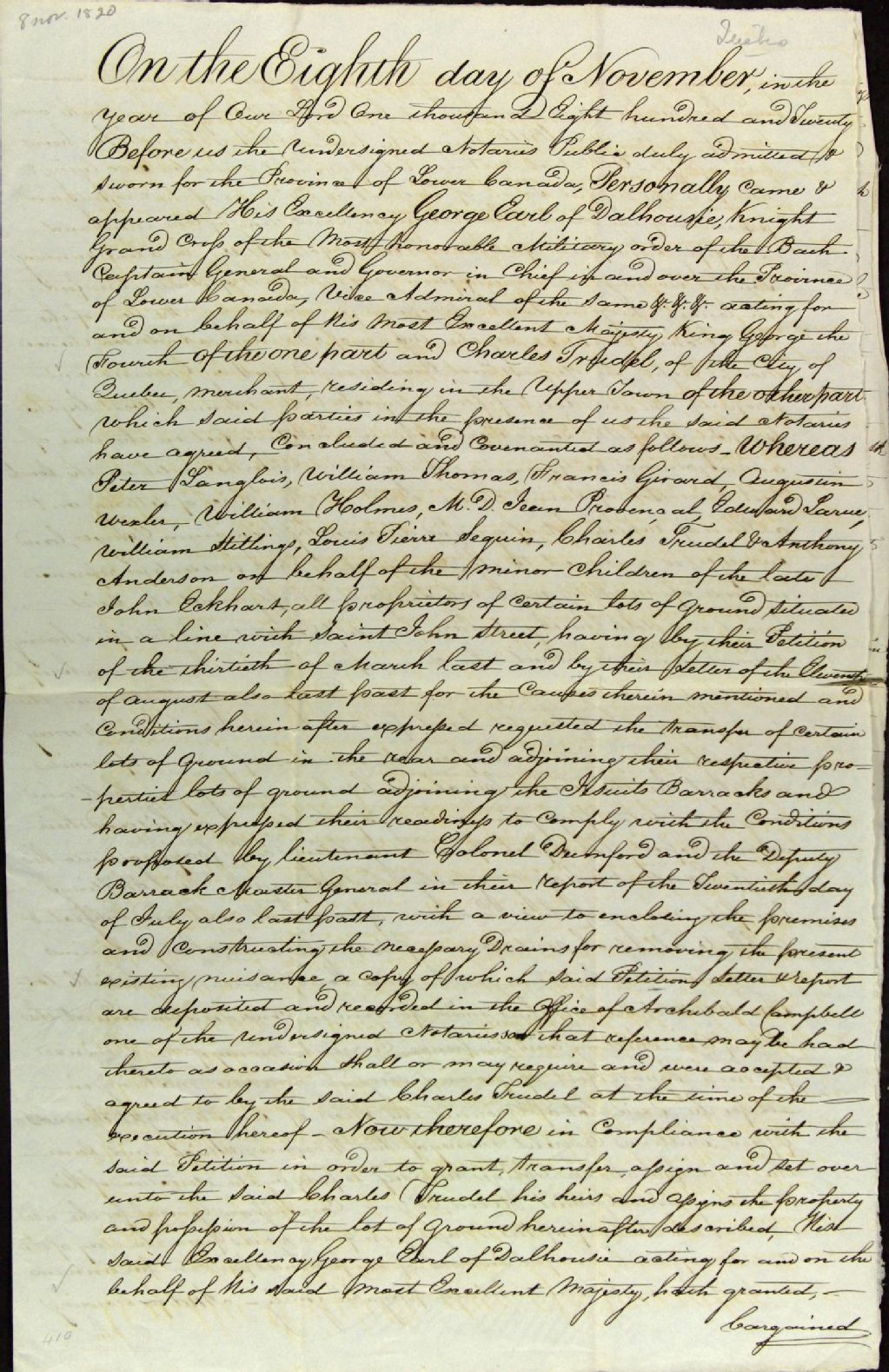 Contrat de vente et de concession du lot de terre numéro deux, en la Haute-Ville de Québec, à Charles Trudel, marchand, résidant dans ladite Haute-Ville, par Son Excellence George [Ramsay], comte de Dalhousie, chevalier, grande croix de l'ordre militaire du Bain [Most Honorable Military Order of the Bath], capitaine général, gouverneur en chef et vice-amiral de la province du Bas-Canada, faisant pour Sa Majesté le Roi George IV, à la suite de la requête présentée par Peter Langlois, William Thomas, Francis Girard, Augustin Wexler, William Holmes, Jean [Isoir dit] Provençal, Edward Larue, William Stillings (Stilling), Louis-Pierre Seguin, Charles Trudel et Anthony Anderson, faisant pour les enfants mineurs du défunt John Eckhart, par-devant C. Huot et Archibald Campbell, notaires publics