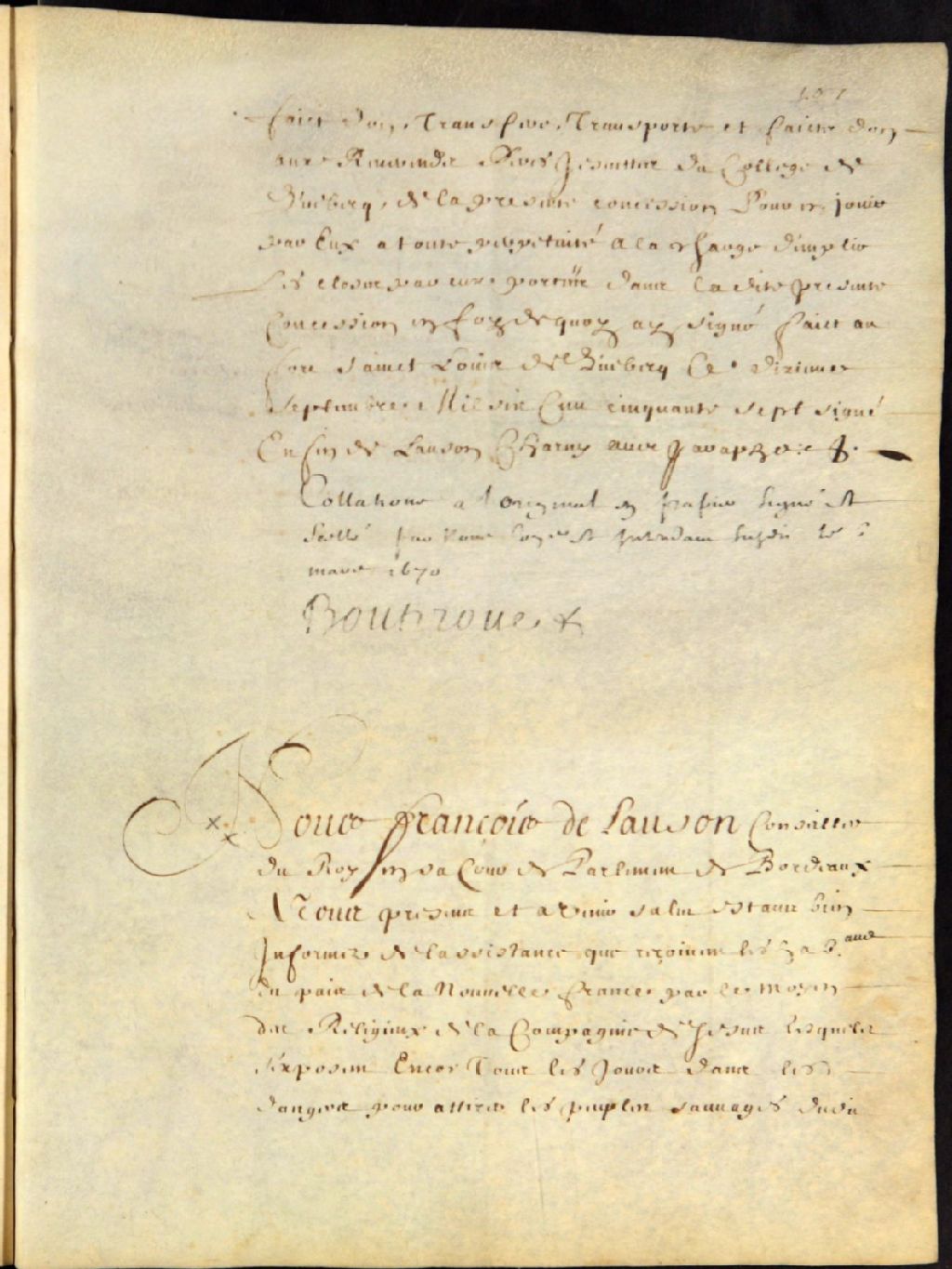 Acte de concession de terres situées à la rivière dite de l'Assomption, tombant dans la rivière des Prairies et dans le fleuve Saint-Laurent vis-à-vis de la pointe de l'île de Montréal, par Jean de Lauson (Lauzon), conseiller ordinaire du Roi en ses conseils d'État et privé, gouverneur et lieutenant général pour Sa Majesté en Nouvelle-France, à messire Charles de Lauson (Lauzon), chevalier, seigneur de Charny, et donation et transport de ladite concession par ledit sieur Charles de Lauson (Lauzon) en faveur des Révérends Pères Jésuites du collège de Québec
