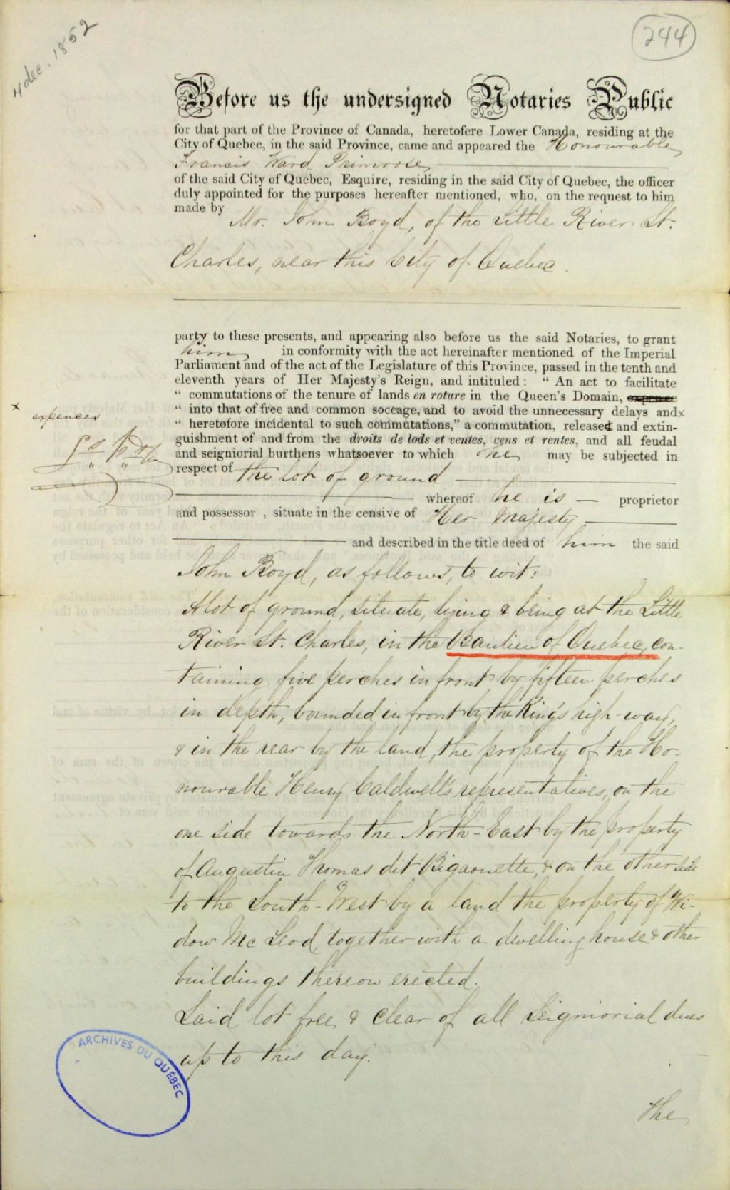 Acte de commutation d'un lot de terre situé à la Petite Rivière Saint-Charles, dans la banlieue de Québec, par l'Honorable Francis Ward Primrose, agent de Sa Majesté et officier dûment nommé, sur la requête à lui faite par monsieur John Boyd, de ladite Petite Rivière Saint-Charles, et conformément à l'acte intitulé «Acte pour faciliter la commutation de la tenure des terres en roture dans le domaine de la Reine en celle de franc et commun socage, et pour éviter les délais et les dépenses inutiles résultant ci-devant de ces commutations», par-devant Philippe Huot et Louis Panet, notaires publics, 4 décembre 1852, Archives nationales à Québec, Fonds Ministère des Terres et Forêts, (03Q,E21,S64,SS5,SSS1,D244).