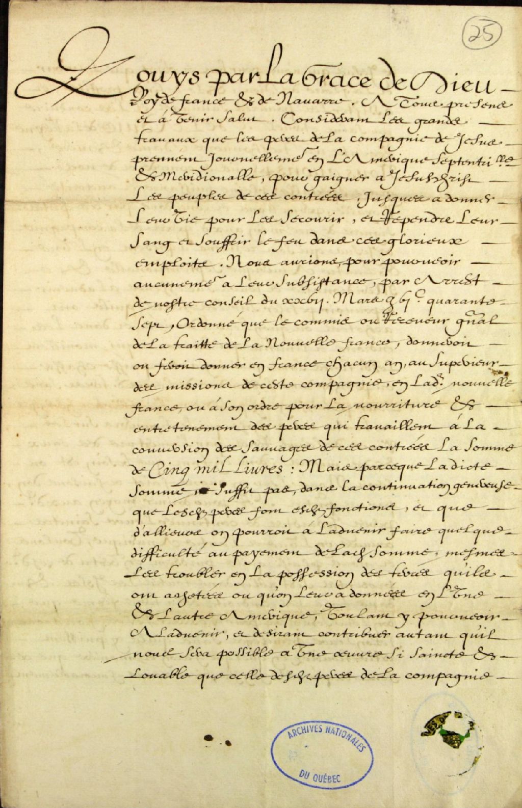 Copie des lettres patentes de Louis, par la grâce de Dieu Roi de France et de Navarre, par lesquelles il fait donation de cinq mille livres aux Pères de la Compagnie de Jésus qui résident à présent en Amérique septentrionale et méridionale pour leur subsistance, et leur accorde à eux et à leurs successeurs le droit de pêche dans toutes les terres qu'ils ont achetées et qu'on leur a données et dans les endroits qui bornent et mouillent lesdites terres, et le droit de s'établir dans toutes les îles et dans tous les endroits de la terre ferme en ladite Amérique, 1er juillet 1651-31 juillet 1651, Archives nationales à Québec, Fonds Ministère des Terres et Forêts, (03Q,E21,S64,SS5,SSS1,D25).