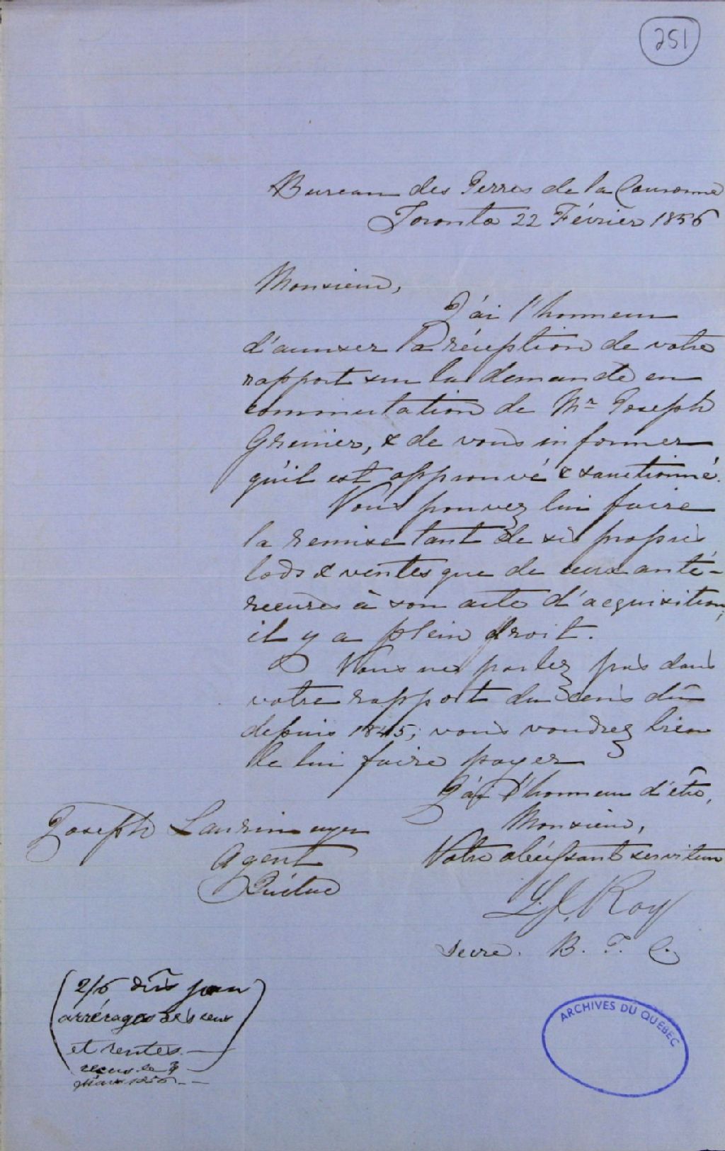 Approbation et sanction du rapport de Joseph Laurin, agent à Québec, par le Bureau des terres de la Couronne à Toronto, à la suite de la demande en commutation présentée par monsieur Joseph Grenier, et permission accordée audit Laurin de procéder à ladite commutation, 22 février 1856, Archives nationales à Québec, Fonds Ministère des Terres et Forêts, (03Q,E21,S64,SS5,SSS1,D251).