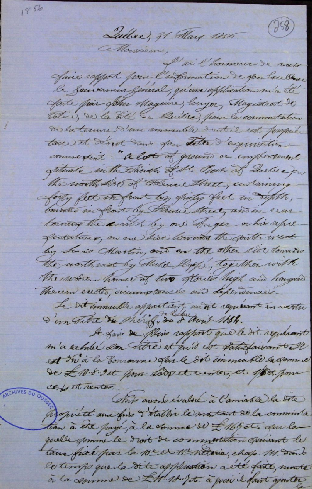Rapport de Joseph Laurin, agent, à l'attention de l'Honorable commissaire des terres de la Couronne à Toronto, pour l'information de Son Excellence le gouverneur général, à la suite de la demande à lui faite par John Maguire, écuyer, magistrat de police, de la ville de Québec, pour obtenir la commutation de la tenure d'un lot de terre ou emplacement situé dans la paroisse de Saint-Roch à Québec, du côté nord de la rue Fleurie, que ledit Maguire a acquis du shérif de Québec, le 8 avril 1854, et requête dudit Laurin pour savoir si l'évaluation à l'amiable qu'il a faite dudit lot est sanctionnée