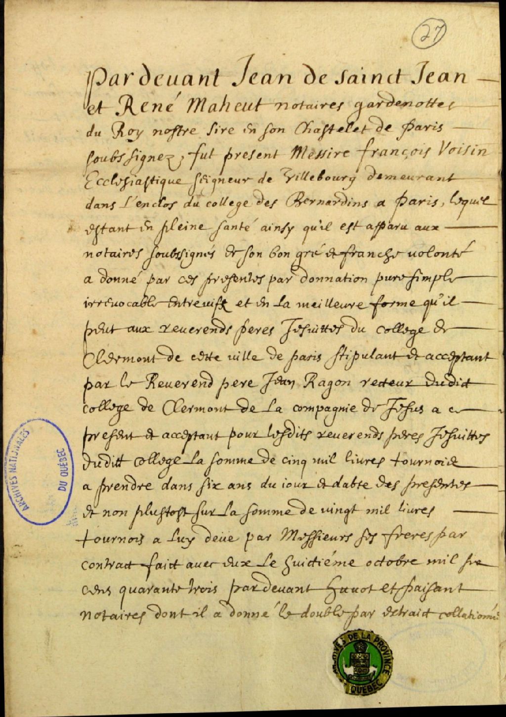 Donation entre vifs de cinq mille livres tournois à prendre dans six ans, dont trois mille cinq cents pour les missions du Canada, pour la conversion des peuples de la Nouvelle-France, par messire François Voisin, ecclésiastique, seigneur de Villebourg, demeurant dans l'enclos du collège des Bernardins à Paris, aux Révérends Pères Jésuites du collège de Clermont à Paris, stipulant et acceptant par le Révérend Père Jean Ragon, recteur dudit collège, par-devant Jean de Saint-Jean et René Maheut (Maheu), notaires et garde-notes du Roi en son Châtelet de Paris